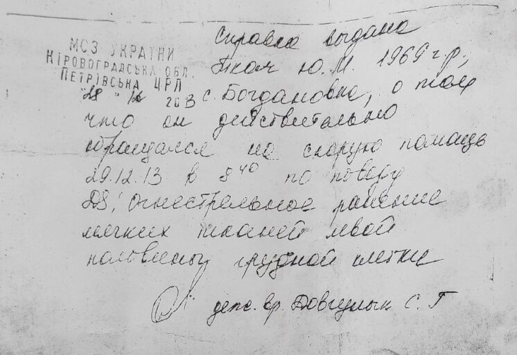 – Да. В правом легком – на снимке видно, что они есть. В 2013 году то же самое было. Тот же Поворознюк. Они прошли насквозь – левую сторону. Есть справка из приемного отделения Петровской центральной больницы.