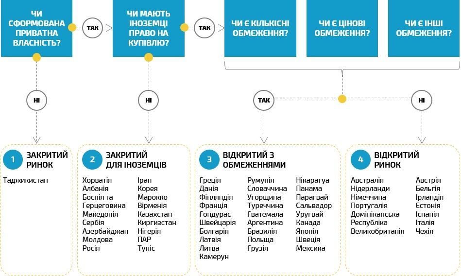 В большинстве стран мира рынок земли работает с ограничениями на покупку земель иностранцами и смену целевого назначения участков. Порядок функционирования рынка в разных государствах описывается в заключении (.doc) Главного научно-экспертного управления Верховной Рады к правительственному законопроекту о рынке земли (этот документ так и не был принят).