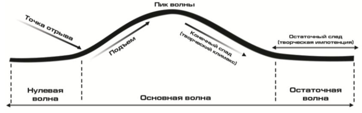 Траектория линии всей творческой жизни человека или отдельных ее периодов имеет форму волны с ярко обозначенными пятью фазами: точка отрыва, подъем, пик, спад и волновой след. Практически любой человек, работающий в творческой профессии, должен пройти эти этапы, а также определенное законами природы количество волн и остаточную волну, включающую в себя так называемый творческий климакс (последний спад) и творческую импотенцию (конец волны). Перед природой все профессии равны и различаются лишь количеством и качеством волн.