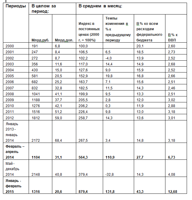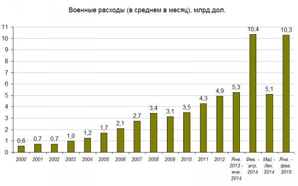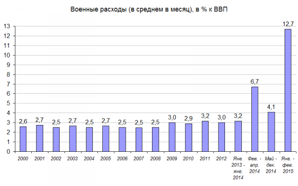 Источник: Минфин России.После принятия кремлевским руководством окончательного решения о нападении на Украину (самое позднее, очевидно, – 9–10 февраля 2014 г.) военные расходы были увеличены более чем вдвое. В то время планировались операции не только по захвату и оккупации Крыма, но и по завоеванию т.н. Новороссии. В феврале – апреле 2014 г. российские военные расходы составили 31 млрд дол., или 6,7% ВВП (27,7% всех бюджетных расходов). В конце апреля 2014 г. военная операция по захвату "Новороссии" была отменена (отложена), среднемесячные военные расходы в мае – декабре 2014 г. были сокращены на треть, по сравнению с уровнем февраля–апреля 2014 г. Следует обратить внимание на то, что не только регулярные воинские маневры, не только передислокация значительного числа войск на российско-украинскую границу, но и даже участие около 10 батальоннно-тактических групп регулярных российских войск непосредственно в боевых действиях на территории Украины (в том числе под Саур-Могилой и Иловайском) в то время не потребовали увеличения военных расходов.Ситуация радикально изменилась в январе–феврале 2015 г. Среднемесячные военные расходы в постоянных ценах были увеличены в 2,3 раз по сравнению даже с предыдущим (военным) периодом (май-декабрь 2014 г.), в 3,3 раз – по сравнению с последним предвоенным периодом (январь 2013 г. – январь 2014 г.), в 8,8 раз – по сравнению с 2000 г. За последние два месяца военные расходы составили свыше 1,3 трлн руб. (более 20 млрд дол., 43,3% всех расходов федерального бюджета, 12,7% ВВП).