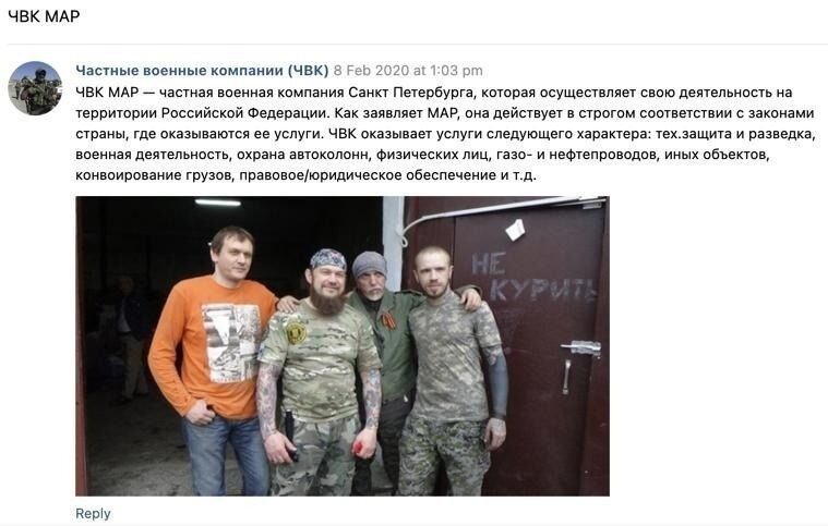 Поэтому команда приняла смелое решение тайно использовать реальную, но прекратившую деятельность ЧВК, которая была основана в Санкт-Петербурге в 2012 году, но впоследствии прекратила свою деятельность. ЧВК "МАР" могла похвастаться участием в нескольких операциях "в интересах России" на востоке Украины в 2014 году. Самопровозглашенное правительство "ДНР" (одного из поддерживаемых Россией сепаратистских образований на востоке Украины) даже хвалило МАР за "поставку гуманитарной помощи". Сайт ЧВК был активен по состоянию на конец 2019 года. Там говорилось, что компания будет выполнять "задачи, которые в силу обстоятельств не может выполнить регулярная армия". Громкие публичные заявления основателя компании Алексея Марущенко (в 2015 году он заявлял, что компания отправила 70 человек на Донбасс и планирует отправить гораздо больше в Сирию и Ливию) помогли МАР приобрести несоразмерную популярность среди желающих пойти в наемники. В то же время международные расследователи вроде Conflict Intelligence Team приводили ЧВК "МАР" как пример "групп-пустышек". На страницах ЧВК в социальных сетях пользователи жаловалось, что ее контактный телефон и адрес электронной почты не отвечают на заявки о трудоустройстве.