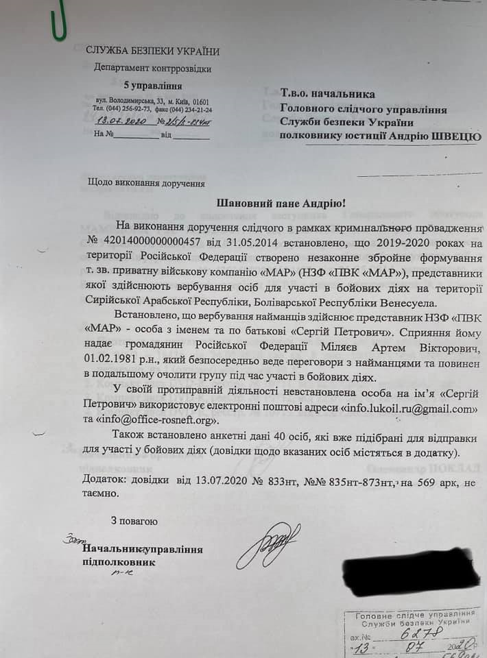 ГУР МОУ потребовалась помощь от СБУ, чтобы составить список наемников, наиболее важных для Украины с уголовной точки зрения. Однако они не могли напрямую поставить такую задачу органу госбезопасности – это предстояло сделать через Офис президента Украины.