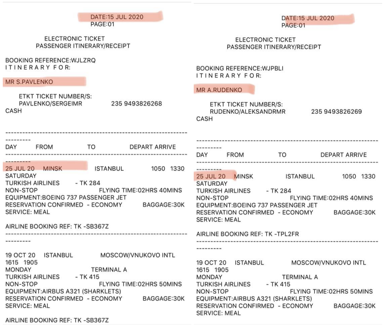 Итак, 15 июля были куплены 34 билета на рейс Минск–Стамбул, который должен был вылететь через 10 дней. Дата возвращения была запланирована на 19 октября, билеты были заказаны на прямой рейс Стамбул – Москва (он должен был вылететь, если позволят COVID-ограничения). Это соответствовало легенде, согласно которой первая "командировка" должна была продлиться три месяца. Из соображений правдоподобия были закуплены и билеты туда и обратно для второй группы из 14 наемников, хотя было маловероятно, что они когда-либо будут использованы.