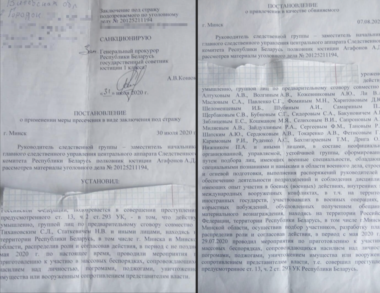 АЛТУХОВ А.В., ВОЛГИН А.В. КОЖЕВНИКОВ А.Ю., ЛИ В. А., МАСЛОВ С. А. МИЛЯЕВ В. А. И ИНЫЕ ЛИЦА, ДЕЙСТВУЯ УМЫШЛЕННО, ГРУППОЙ ЛИЦ ПО ПРЕДВАРИТЕЛЬНОМУ СГОВОРУ, НАХОДЯСЬ НА ТЕРРИТОРИИ РЕСПУБЛИКИ БЕЛАРУСЬ, В ТОМ ЧИСЛЕ Г. МИНСКА И МИНСКОЙ ОБЛАСТИ, РАСПРЕДЕЛИВ РОЛИ И СОГЛАСОВАВ ДЕЙСТВИЯ, В ПЕРИОД С НЕ ПОЗДНЕЕ МАЯ 2020 Г. ПО НАСТОЯЩЕЕ ВРЕМЯ, ПРОВОДИЛИ МЕРОПРИЯТИЯ ПО ПРИГОТОВЛЕНИЮ К УЧАСТИЮ В МАССОВЫХ БЕСПОРЯДКАХ, СОПРОВОЖДАЮЩИХСЯ НАСИЛИЕМ НАД ЛИЧНОСТЬЮ, ПОГРОМАМИ, ПОДЖОГАМИ, УНИЧТОЖЕНИЕМ ИМУЩЕСТВА ИЛИ ВООРУЖЕННЫМ СОПРОТИВЛЕНИЕМ ПРЕДСТАВИТЕЛЯМ ВЛАСТИ. ****Выдержка из базы данных уголовных производств Беларуси, предоставлена хактивистской группой "Белорусские Кибер-Партизаны".
