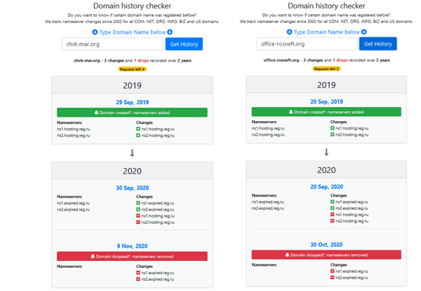 Анализ DNS-истории доменов chvk-mar.org и office-rosneft.org показывает, что они были зарегистрированы с разницей в девять дней в конце сентября 2019 года, что соответствует хронологии, изложенной бывшими сотрудниками спецслужб, которые дали интервью Bellingcat.