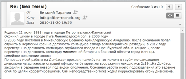 Соискатели так и поступали. К началу июня 2020 года на два электронных адреса, подконтрольных ГУР МОУ, пришли сотни страниц подробных, собственноручно написанных признаний в участии в военных действиях в Восточной Европе, на Ближнем Востоке и в Африке, а также имена командиров, фотографии медалей, выданных Кремлем, и даже ранее неизвестные видео- и фотоматериалы о сбитии украинского военного вертолета над Донбассом в 2014 году.