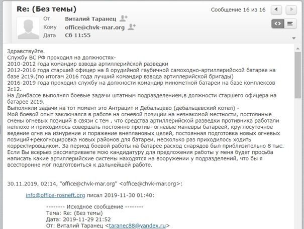 Согласно интервью с бывшими сотрудниками ГУР МОУ, эти комментарии появились из-за того, что фиктивная вербовка привлекла слишком много кандидатов, которые не подходили для ее целей. У некоторых имелся боевой опыт, но они никогда не воевали на Донбассе и потому не представляли интереса для украинской военной разведки. Действительно, электронные письма от соискателей на электронную почту [email protected], подконтрольную ГУР МОУ (письмами поделились с командой Bellingcat), показали, что хотя они не принимали участия в операциях на востоке Украины, по крайней мере некоторые из них воевали в Афганистане и Чечне.