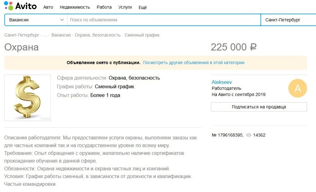 25 сентября 2019 года на популярной российской онлайн-доске объявлений Avito.ru в разделе вакансий в сфере безопасности в Санкт-Петербурге пользователь Alekseev опубликовал объявление (вот его оригинал, вот архивная версия).