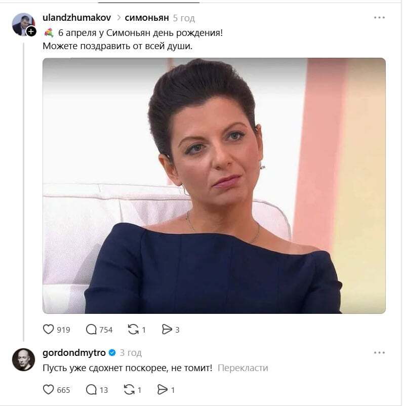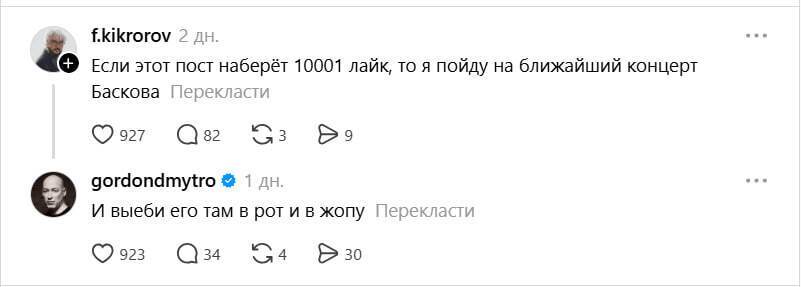 Он также жестко высмеивает российских пропагандистов, которые пытаются набрать аудиторию в Threads. Гордон отметил, что российский исполнитель песен, путинист Николай Басков заблокировал его после того, как прочитал комментарий.