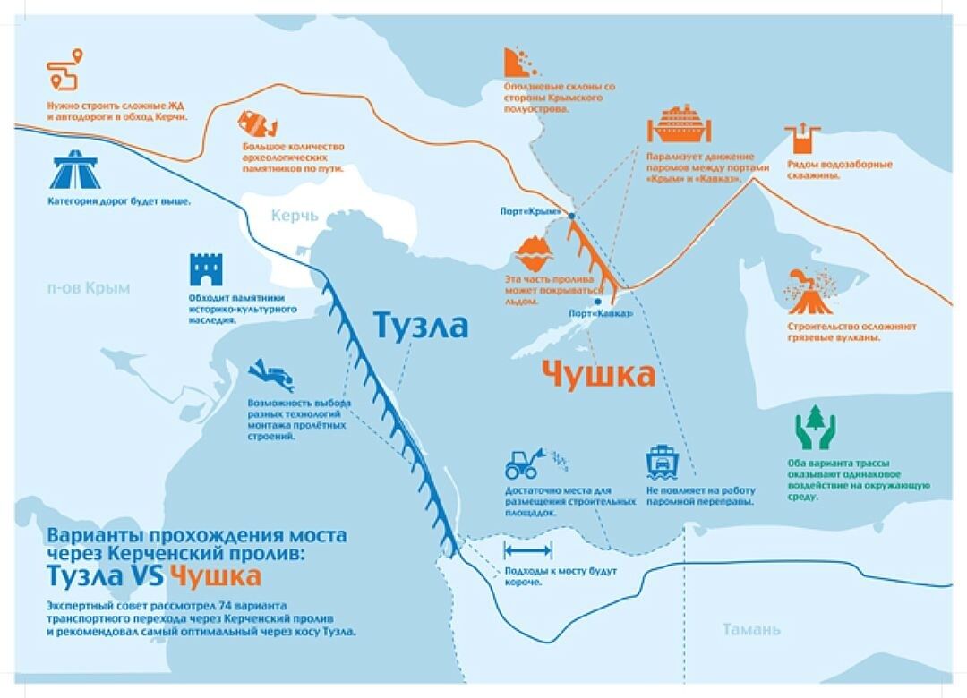 Строительство моста в Крым началось в 2014 году после аннексии полуострова. В июне в РФ утвердили проект моста, проходящего через косу Тузла. Несмотря на то, что этот вариант длиннее, в России обосновали его сразу несколькими преимуществами. Во-первых, в этом случае можно соорудить более удобные транспортные развязки, во-вторых – больше места для установки сложной техники. Немалую роль сыграло и то, что при таком варианте не будет помех для работы паромной переправы, которая сейчас соединияет Крым с Россией.