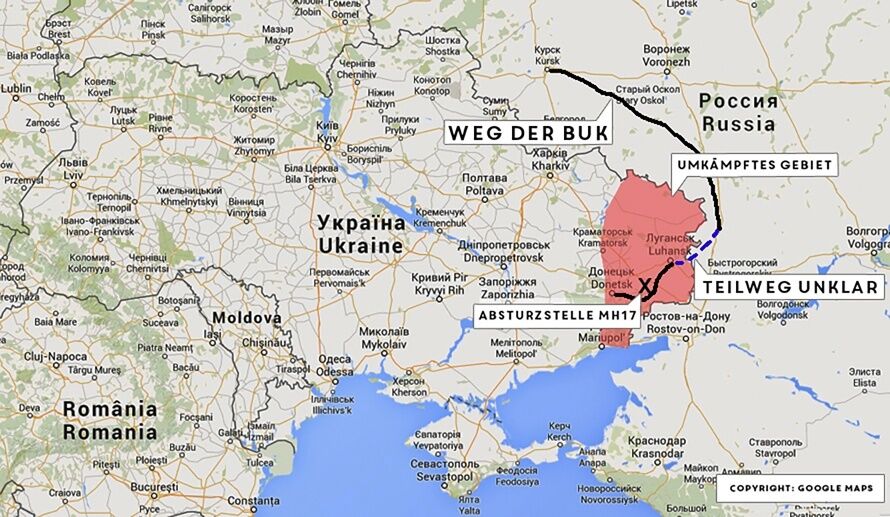 CORRECT!V проверила данные команды из Великобритании Bellingcat.com, которую возглавляет журналист Элиот Хиггинс. Команда скрупулезно изучила все материалы из Интернета – фото, записи в социальных сетях, видео – и пришли к выводу, что стрелявший "Бук" доставлен из Курска.