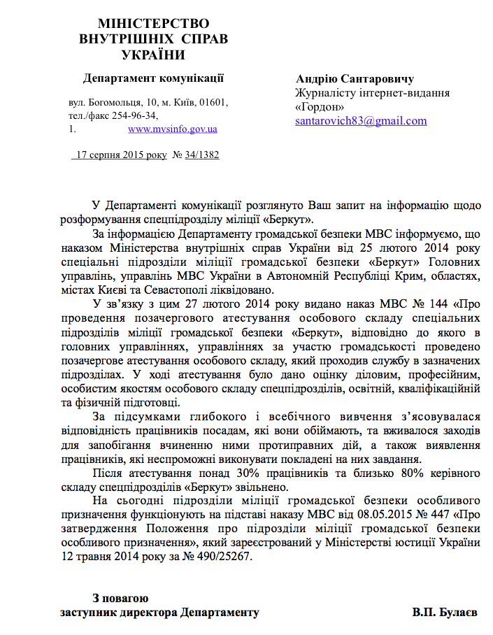 О переходе экс-бойцов "Беркута" в новые специальные подразделения милиции общественной безопасности особого назначения МВД Украины говорится в официальном ответе ведомства на запрос интернет-издания "ГОРДОН".