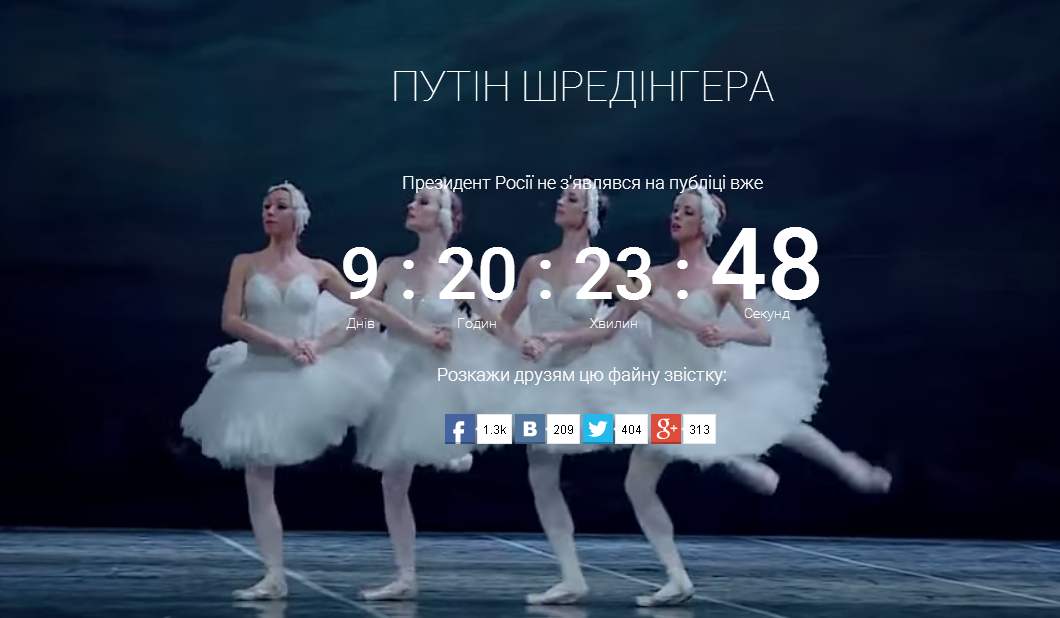 Социальные сети ждут, когда станет доподлинно известно, что с Путиным. И на всякий случай пересматривают "Лебединое озеро" и сверяются с сайтом "Путин Шредингера", запущенным украинцем Андреем Капрановым, где сообщается, сколько времени не появляется на публике российский президент.