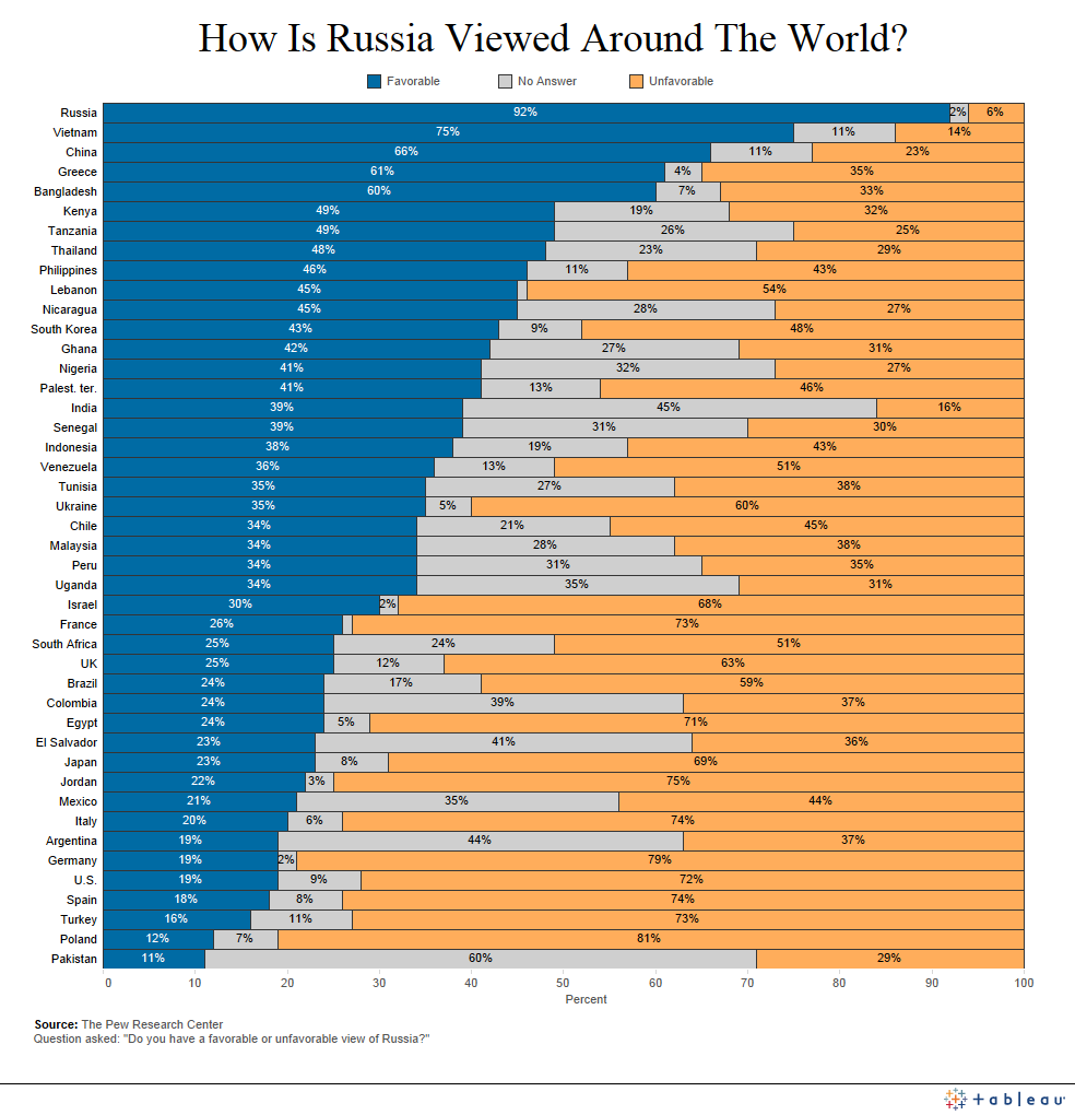 81% опрошенных поляков заявили о негативном отношении к этой стране, 79% немцев, 75% граждан Иордании, 74% – Испании и Италии. Одним процентом меньше недоброжелательности к россиянам у жителей Турции и Франции, 72% американцев недолюбливают Россию. Также большинство населения Египта, Японии, Израиля, Великобритании, Бразилии, Ливана, Южной Африки и Венесуэлы негативно воспринимают РФ.
