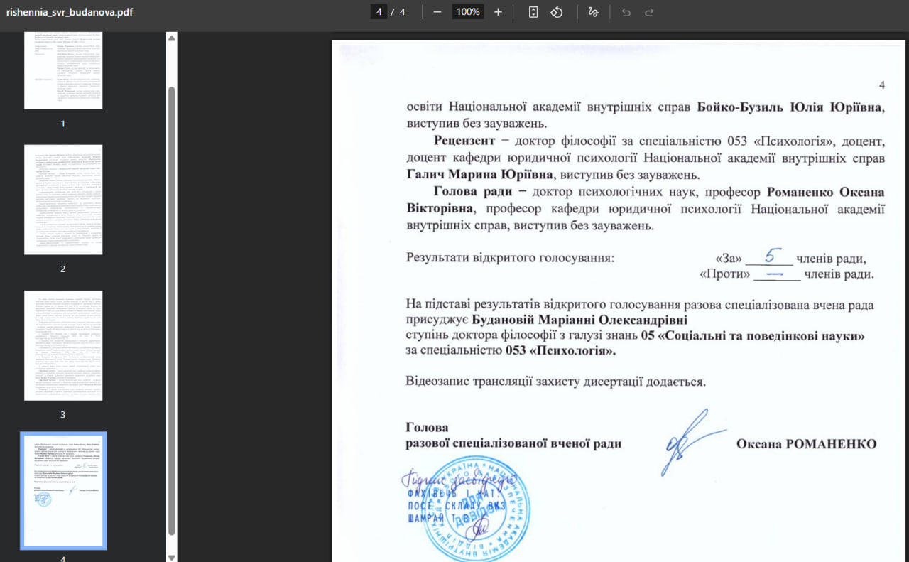 В сентябре 2025 года Буданова защитила диссертацию и получила степень доктора философии по специальности "Психология". Трансляция защиты диссертации на тему "Психологические особенности личностных трансформаций сотрудников Национальной полиции Украины в условиях военного положения" велась на YouTube-канале Национальной академии внутренних дел 29 сентября 2025 года.