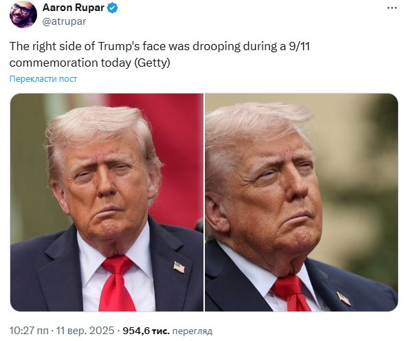 — Jeremy Kaplowitz (@jeremysmiles) September 11, 2025Также на лицо Трампа обратил внимание журналист Аарон Рупар. "Правая сторона лица Трампа была обвисшей во время мероприятия в память об 11 сентября", – написал он.