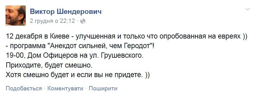 Вернувшись на днях из Израиля, где его концерты проходили в разных городах, Виктор Шендерович уже собирается в Киев, о чем поделился с читателями своего Facebook.