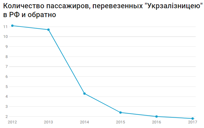 По данным "Укрзалізниці", количество пассажиров, которых компания перевозит в РФ и обратно, на протяжении последних шести лет уменьшалось. В 2012 году таких пассажиров было 11,1 млн, в 2013-м – 10,7 млн, в 2014-м – 4,3 млн, в 2015-м – 2,4 млн, в 2016-м – 2 млн, в 2017-м – 1,8 млн. Общий пассажиропоток "Укрзалізниці" в 2017 году составил 206,636 млн человек, а в 2016-м – 438,2 млн. Доля людей, путешествующих в Россию и обратно, составляла 0,88% и 0,46% соответственно.