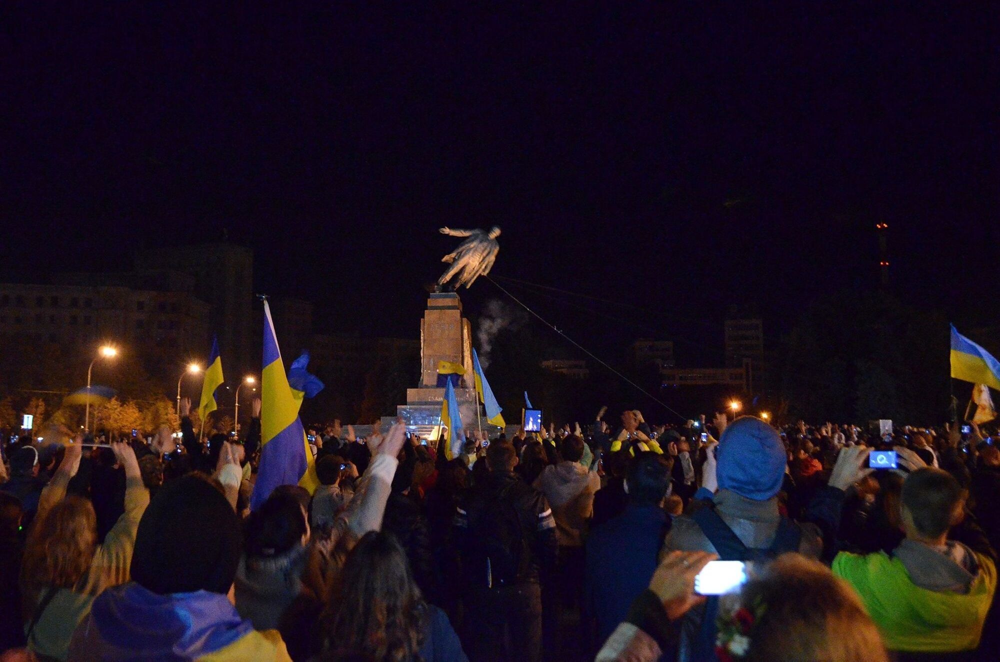 Теперь, еще раз, Геращенко в Харькове, митинг при его поддержке проходит триумфально – и Ленин наконец-то падает. Почему сейчас? Почему все-таки это окончилось успешно? Возможно, потому, что "Народному фронту" не хватает нескольких процентов поддержки для гарантированного попадания в Верховную Раду нового созыва, а именно в Харькове кандидаты в народные депутаты от "Народного фронта" Арсен Аваков и Антон Геращенко могли организовать столь громкую и заметную патриотическую акцию, именно Харьков и патриотически настроенные жители других крупных украинских городов, с радостью встретившие новость о падении Ленина, способны стать новым, столь необходимым несколькопроцентным оплотом "Народного фронта". То есть, все это очень похоже на использование служебного положения с предвыборной выгодой для себя и к удовольствию патриотов с пустой риторикой о том, что теперь, мол, и Харьков становится другим.