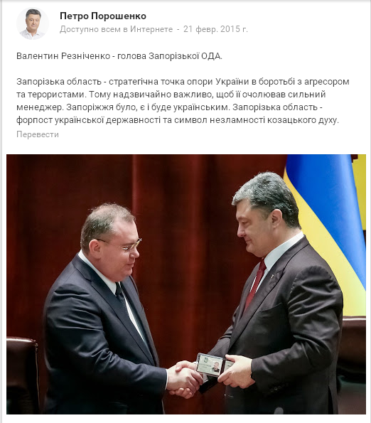 В блоге на Google+ Порошенко 21 февраля 2015 года написал: "Запорожская область – стратегическая точка опоры Украины в борьбе с агрессором и террористами. Поэтому чрезвычайно важно, чтобы ее возглавлял сильный менеджер. Запорожье было, есть и будет украинским. Запорожская область – форпост украинской государственности и символ несокрушимости казацкого духа".