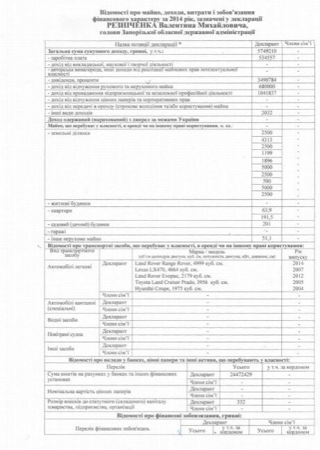 На официальном сайте Запорожской облгосадминистрации была опубликована декларация о доходах Валентина Резниченко за 2014 год. Его доходы за год превысили пять миллионов гривен, в собственности бывшего губернатора две квартиры, 10 земельных участков, дачный дом площадью 210 квадратных метров. Автопарк чиновника состоит из автомобилей: Land Rover Range Rover, Lexus LX470, Land Rover Evoque, Toyota Land Cruiser Prada, Hyundai Coupe.