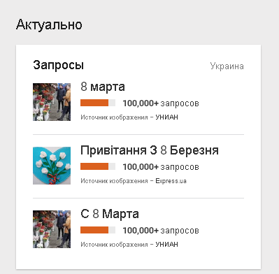 В Международный женский день поисковик взорвали такие запросы, как "поздравления женщинам", "8 марта", "с 8 марта", причем у каждого запроса более чем 100 тысяч обращений.