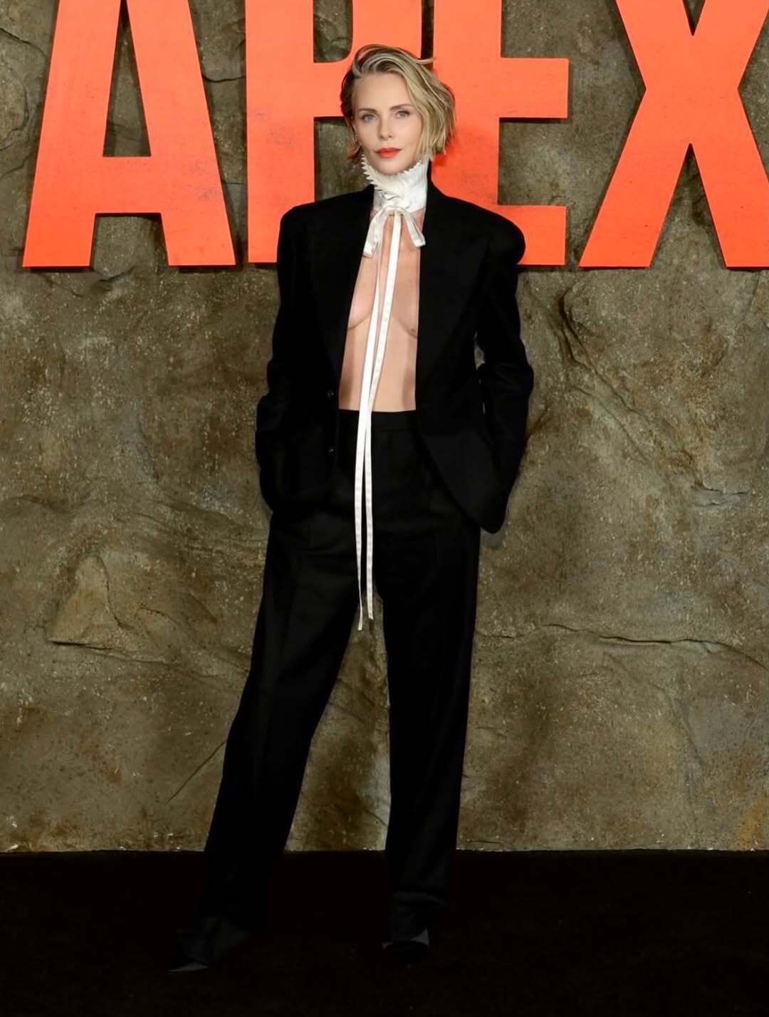 Американская актриса Шарлиз Терон появилась на красной дорожке во время премьеры боевика "Апекс" (Netflix) в мужском брючном костюме от французского бренда Dior. Свой образ она дополнила белым плисированным воротником на завязках. Фото с мероприятия звезда разместила в 23 апреля в Instagram.