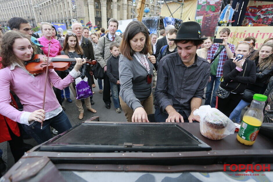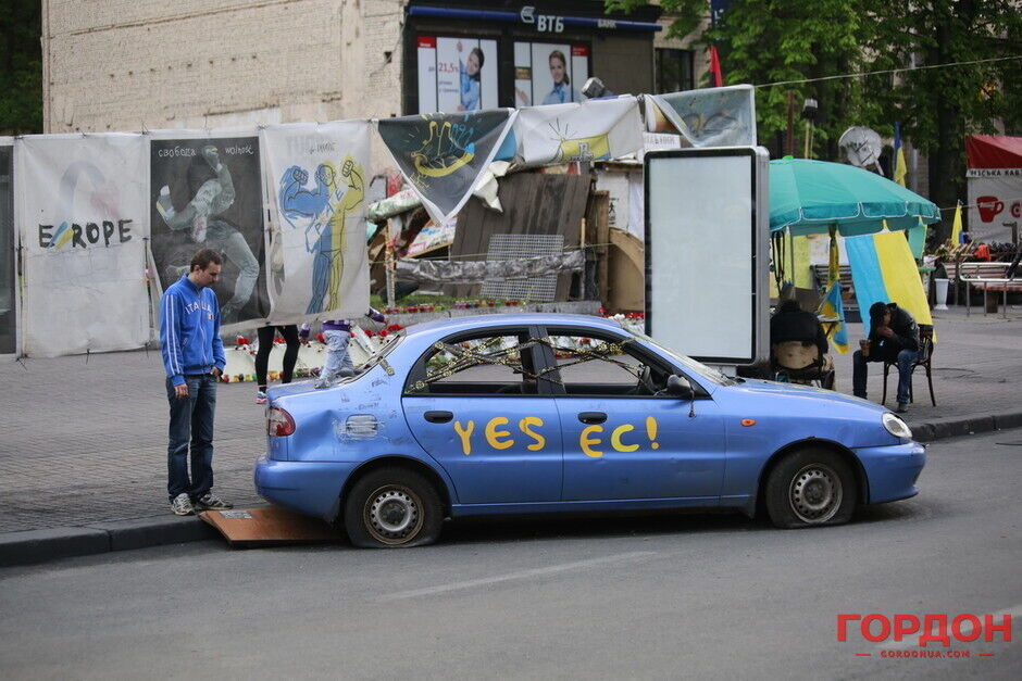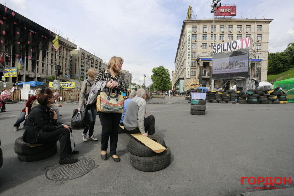 На Майдане остатки войны, такие, например, как сожженный автобус, совершенно мирно соседствуют с предметами, которые ассоциируются с мещанским бытом – притянутыми неизвестно откуда креслами, диванами и даже телевизорами.