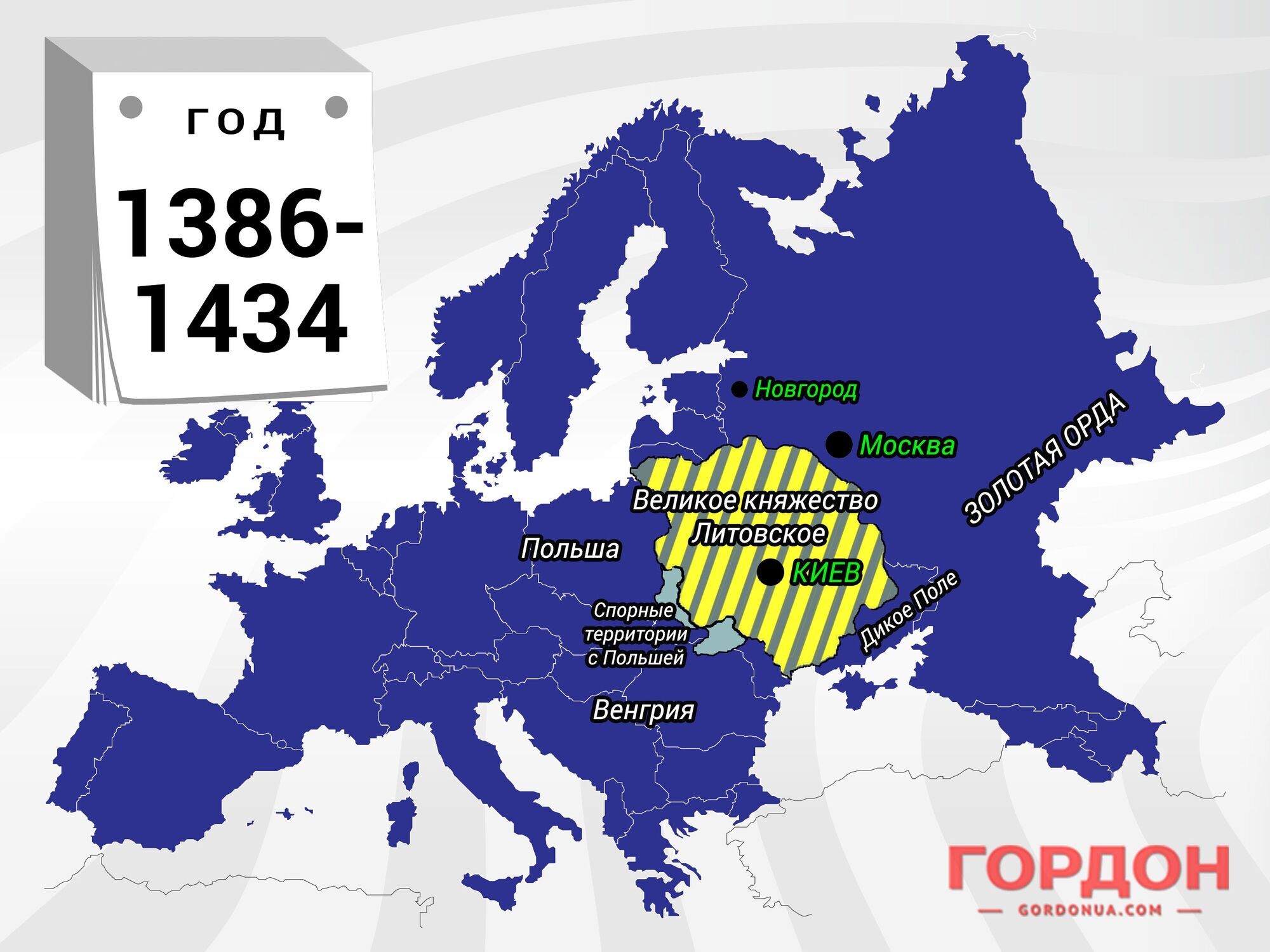 Великий князь литовский Ольгерд в 1362 году разбил монголов при Синих Водах (на территории современной Кировоградской области, возле Новоархангельска) и присоединил Подольскую землю. Затем он сместил княжившего в Киеве Федора, подчиненного Золотой Орде, и отдал город своему сыну Владимиру. В первое время эти земли перестали платить дань Орде, в которой тогда шла борьба за власть. В 1386 году великим князем литовским стал Ягайло. Он принял католичество и правил в Польше под именем Владислава II до 1434 года. Много православных князей выступало против сближения с Польшей: в 1381–1384, в 1389–1392 и 1432–1439 прошли три гражданских войны. Многие города, среди которых, например, Львов, Киев, Владимир-Волынский, получили собственное самоуправление, так называемое магдебургское право.