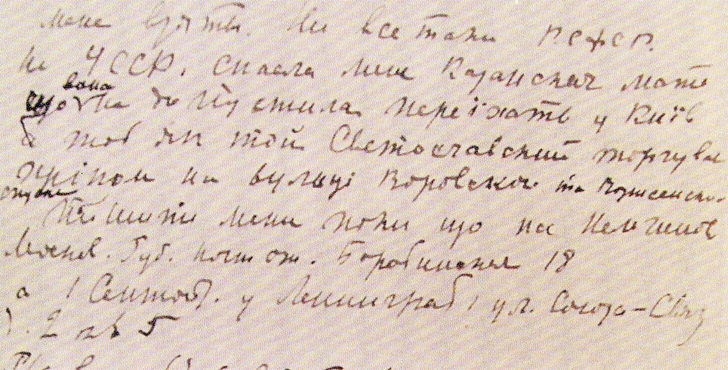 Малевич часто писал письма на украинском языке, а иногда – на некой забавной смеси русского и украинского языков, из которой можно было понять, что последний он знает очень хорошо. Вот, к примеру, цитата из письма Малевича жене художника Льва Крамаренко Ирине Жданко (сохранились, кстати, ее воспоминания о том, как они с Малевичем рисовали пейзажи Святошино в 1930 году):