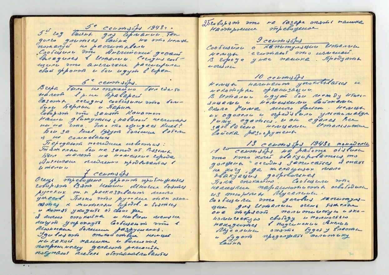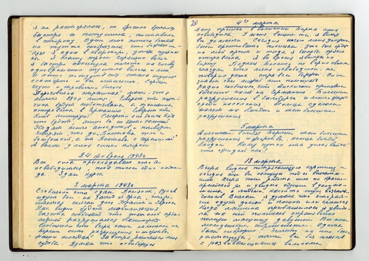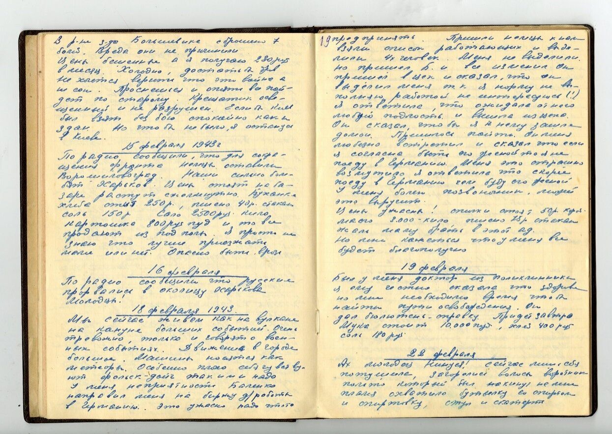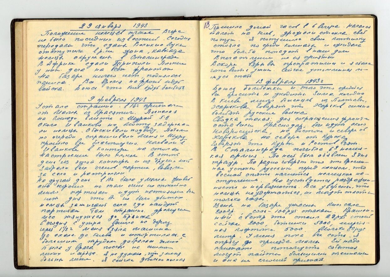 Положение немцев плохое. Вчера не было последних известий. Сегодня передали, что сданы Великие Луки, отступили в районе Дона, Кавказа. Немцы окружены в Сталинграде. В Африке сдали Триполи. Плохие у них дела на всех фронтах. На базаре ничего нет, поднялась паника. Все время на фронт идут войска. Боюсь, что Киев будут бомбить.