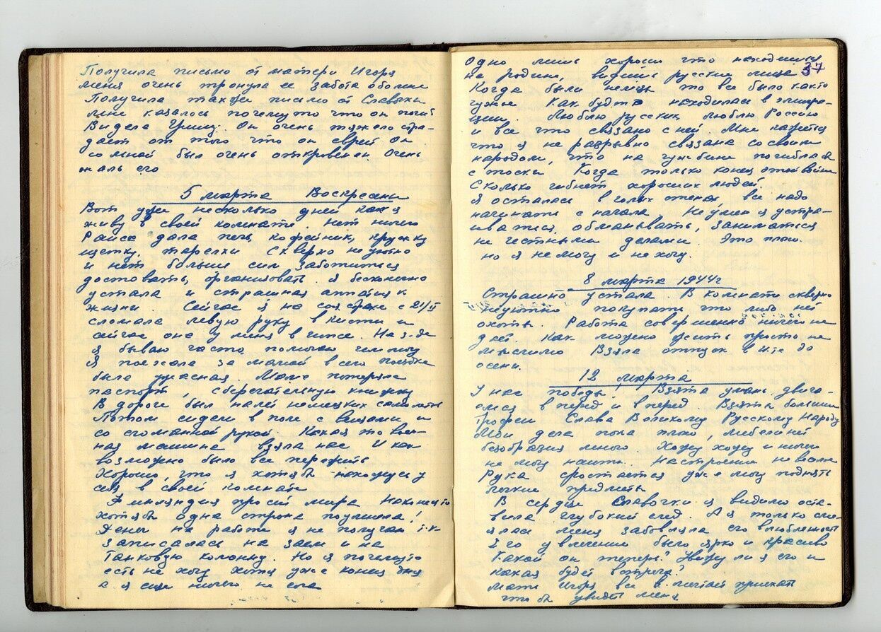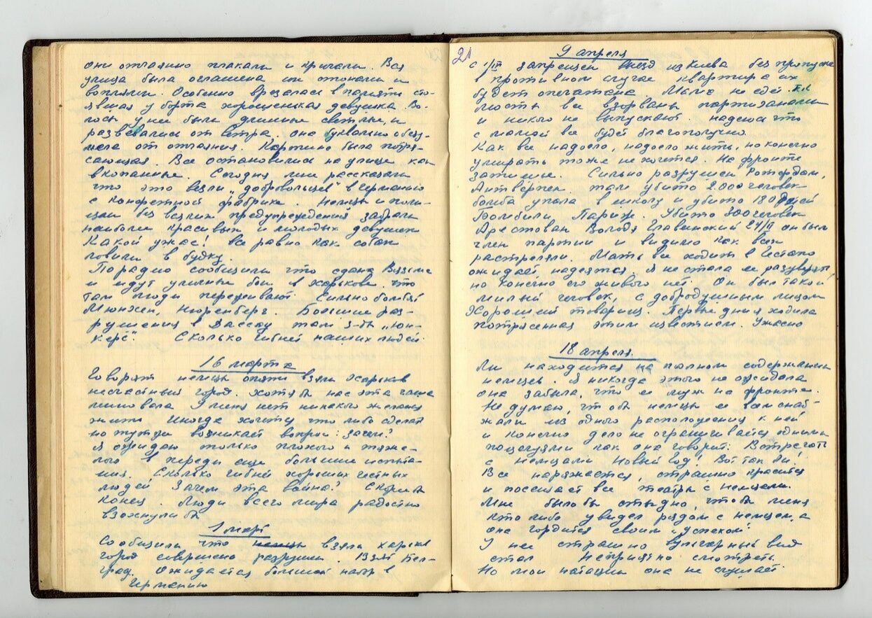 Как все надоело, надоело жить, но, конечно, умирать тоже не хочется. На фронте затишье. Сильно разрушены Роттердам, Антверпен, там убито 2000 человек, бомба упала в школу и убито 180 детей. Бомбили Париж. Убито 300 человек. Арестован Володя Главинский 24.02. Он был член партии и, видимо, как всех, расстреляли. Мать все ходит в Гестапо, ожидает, надеется. Я не стала ее разуверять, но, конечно, его живого нет. Он был такой милый человек, с добродушным лицом. Хороший товарищ. Первые дни я ходила потрясенная этим известием. Ужасно.