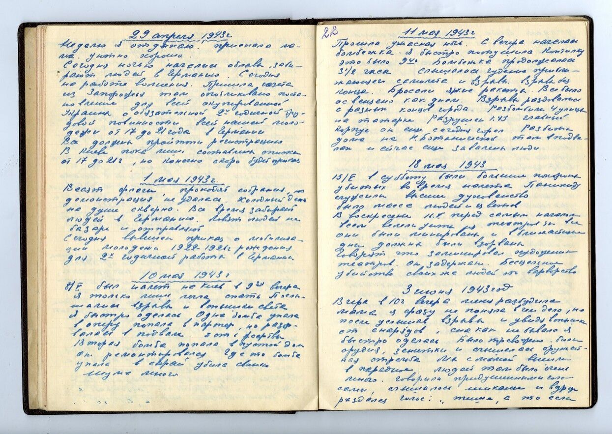 Сегодня ночью началась облава, забирают людей в Германию. Сегодня на работе волнения. Пришла газета из Запорожья, там опубликовано постановление для всей оккупированной Украины об обязательной двухгодичной трудовой повинности всей нашей молодежи от 17 до 21 года в Германии. Все должны пройти регистрацию. В Киеве пока лишь составили список, но, конечно, скоро будет приказ.