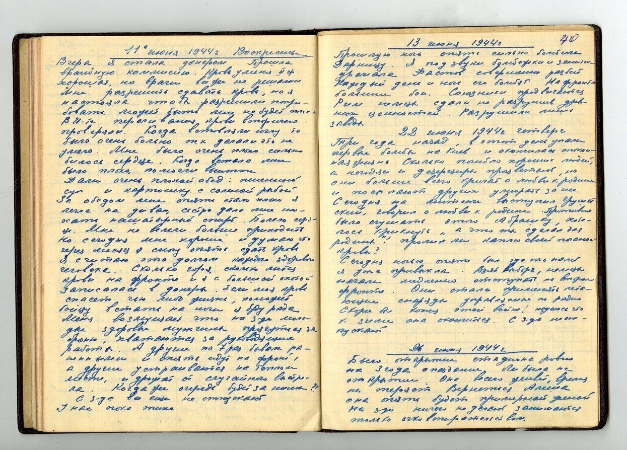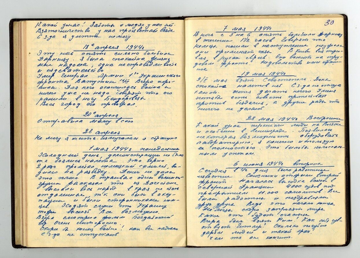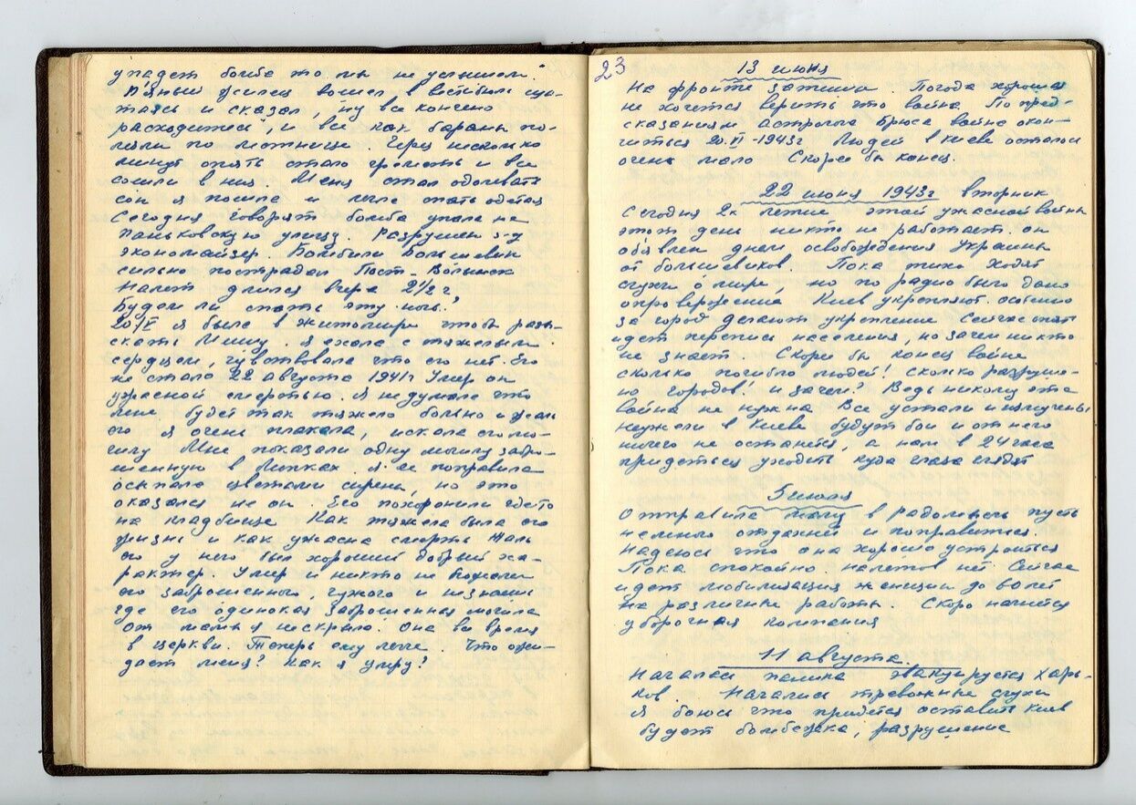 На фронте затишье. Погода хорошая. Не хочется верить, что война. По предсказаниям астролога Брюса, война окончится 20.06.1943. Людей в Киеве осталось очень мало. Скорее бы конец.