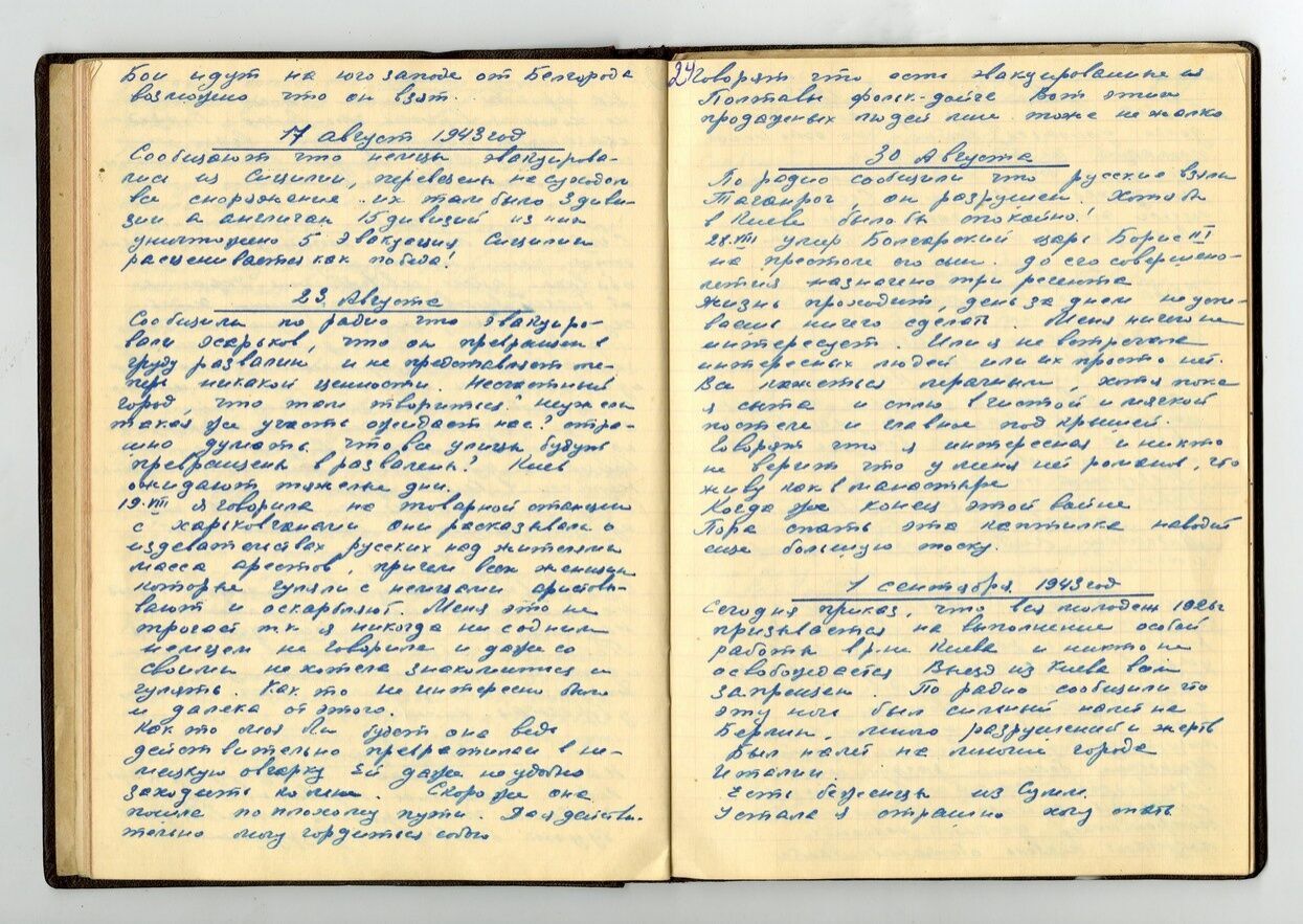 Сегодня двухлетие этой ужасной войны. В этот день никто не работает. Он объявлен днем освобождения Украины от большевиков. Пока тихо. Ходят слухи о мире, но по радио было дано опровержение. Киев укрепляют. Особенно за городом делают укрепления. Сейчас опять идет перепись населения, но зачем, никто не знает. Скорее бы конец войне. Сколько разрушено городов! И зачем? Ведь никому эта война не нужна. Все устали и измучены. Неужели в Киеве будут бои и от него ничего не останется, а нам в 24 часа придется уходить, куда глаза глядят.