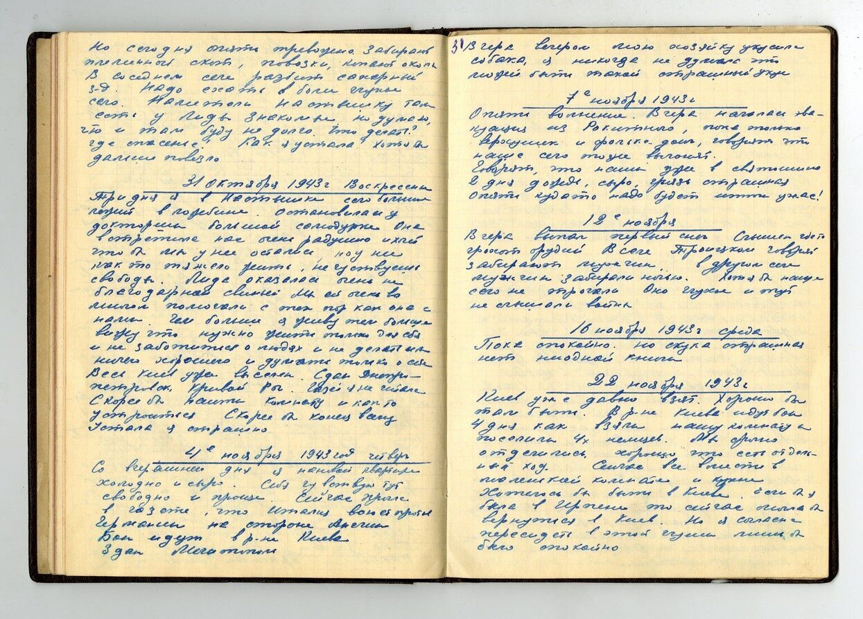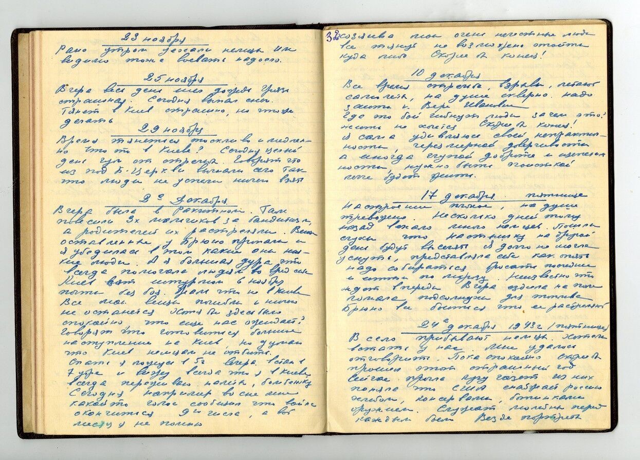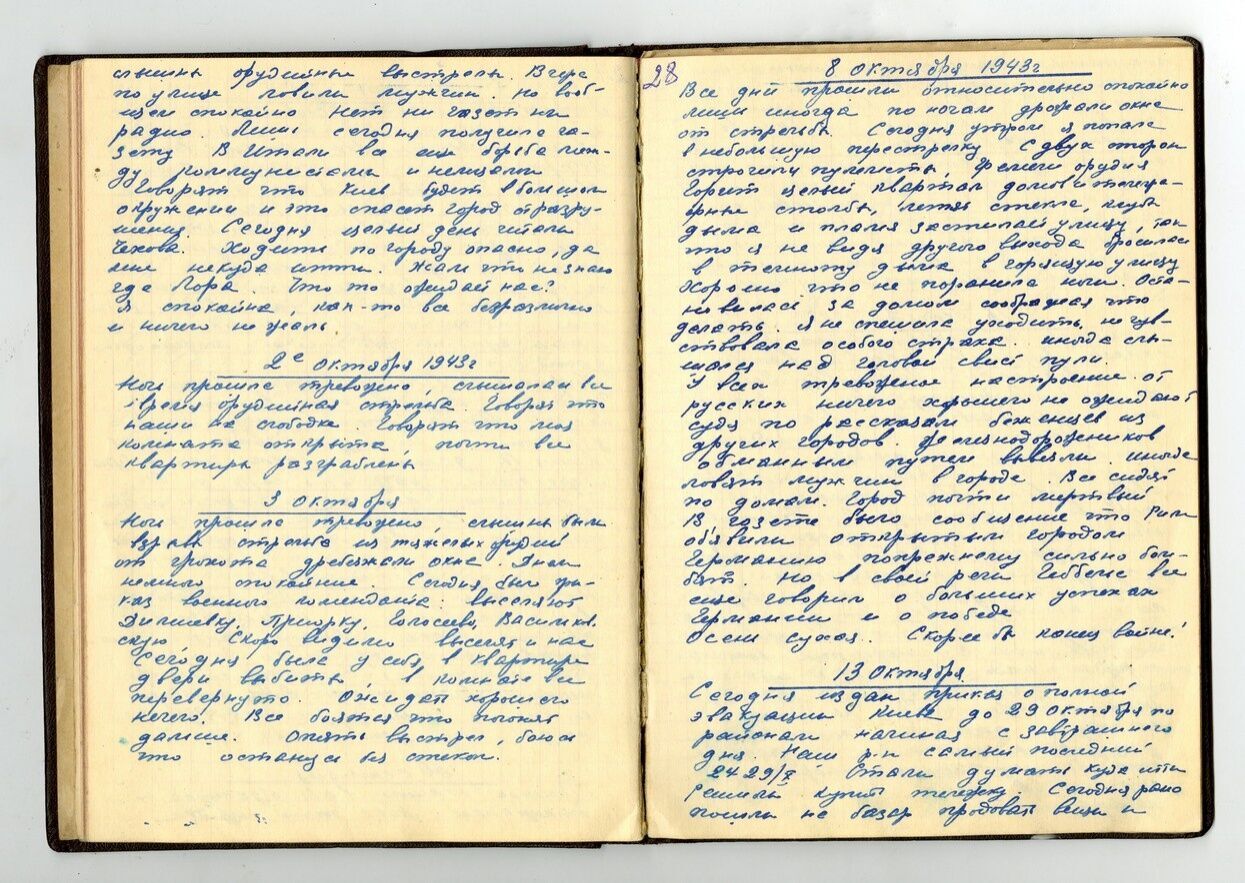 В районе заводе "Большевик" сброшено семь бомб. Вреда они не причинили. Цены бешеные, а я получаю 230 рублей в месяц. Холодно, достать бы дров. Не хочется верить, что это война, а не сон. Проснешься – и опять все пойдет по-старому. Крещатик освещенный и не разрушен. Если бы Киев был взят без боя, спокойно, как и сдан. Но что бы ни было, я останусь в Киеве.