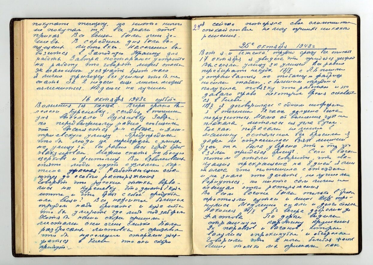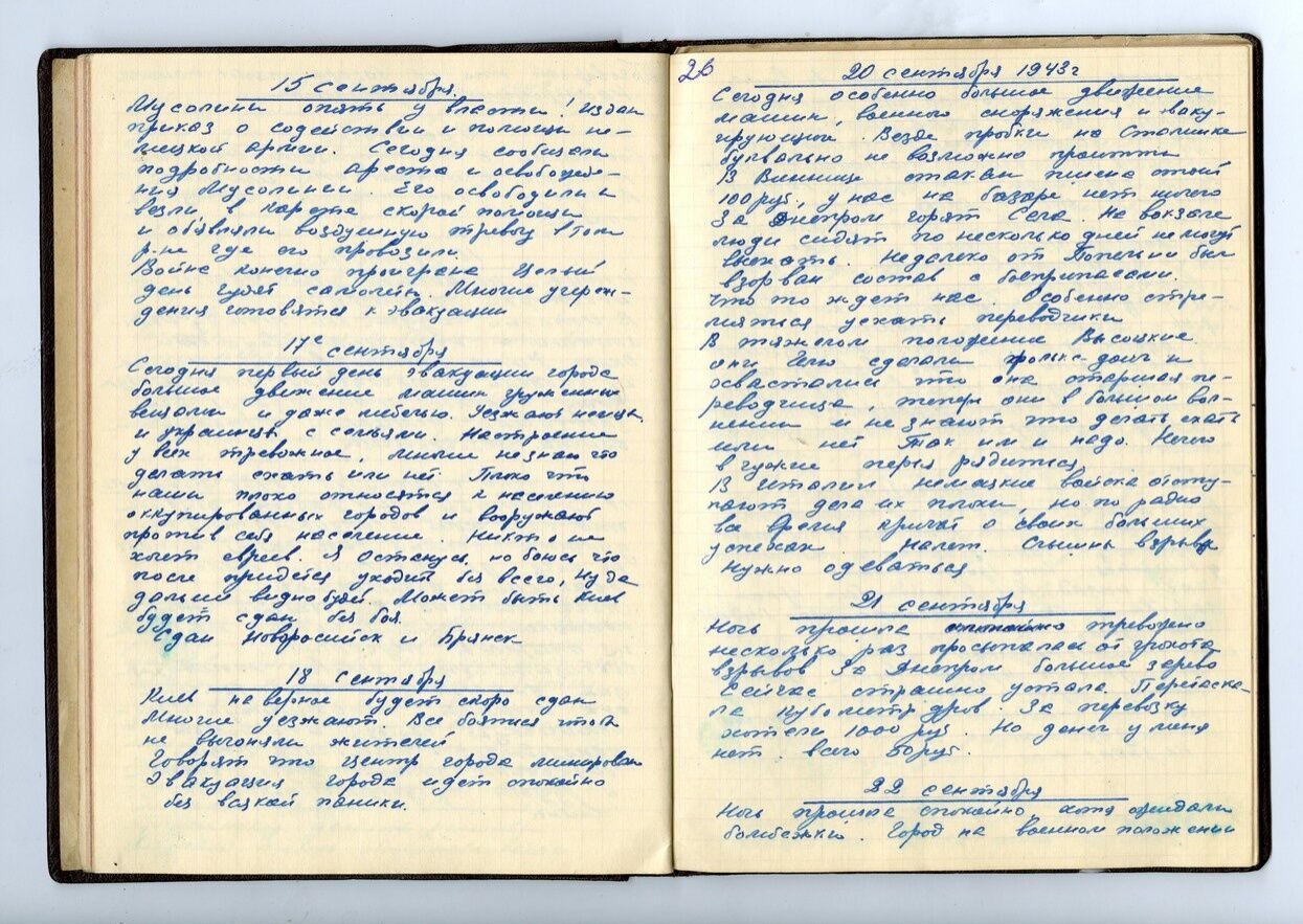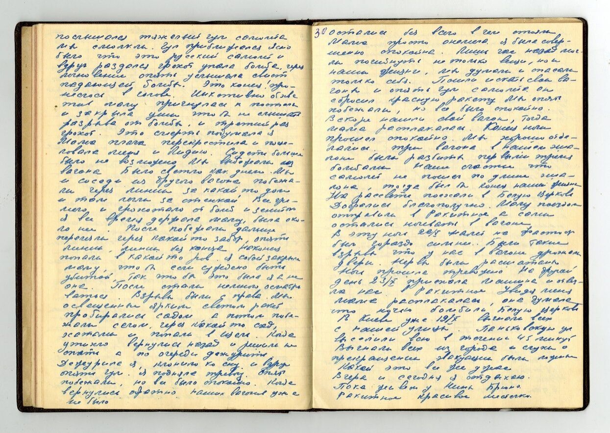 В районе заводе "Большевик" сброшено семь бомб. Вреда они не причинили. Цены бешеные, а я получаю 230 рублей в месяц. Холодно, достать бы дров. Не хочется верить, что это война, а не сон. Проснешься – и опять все пойдет по-старому. Крещатик освещенный и не разрушен. Если бы Киев был взят без боя, спокойно, как и сдан. Но что бы ни было, я останусь в Киеве.