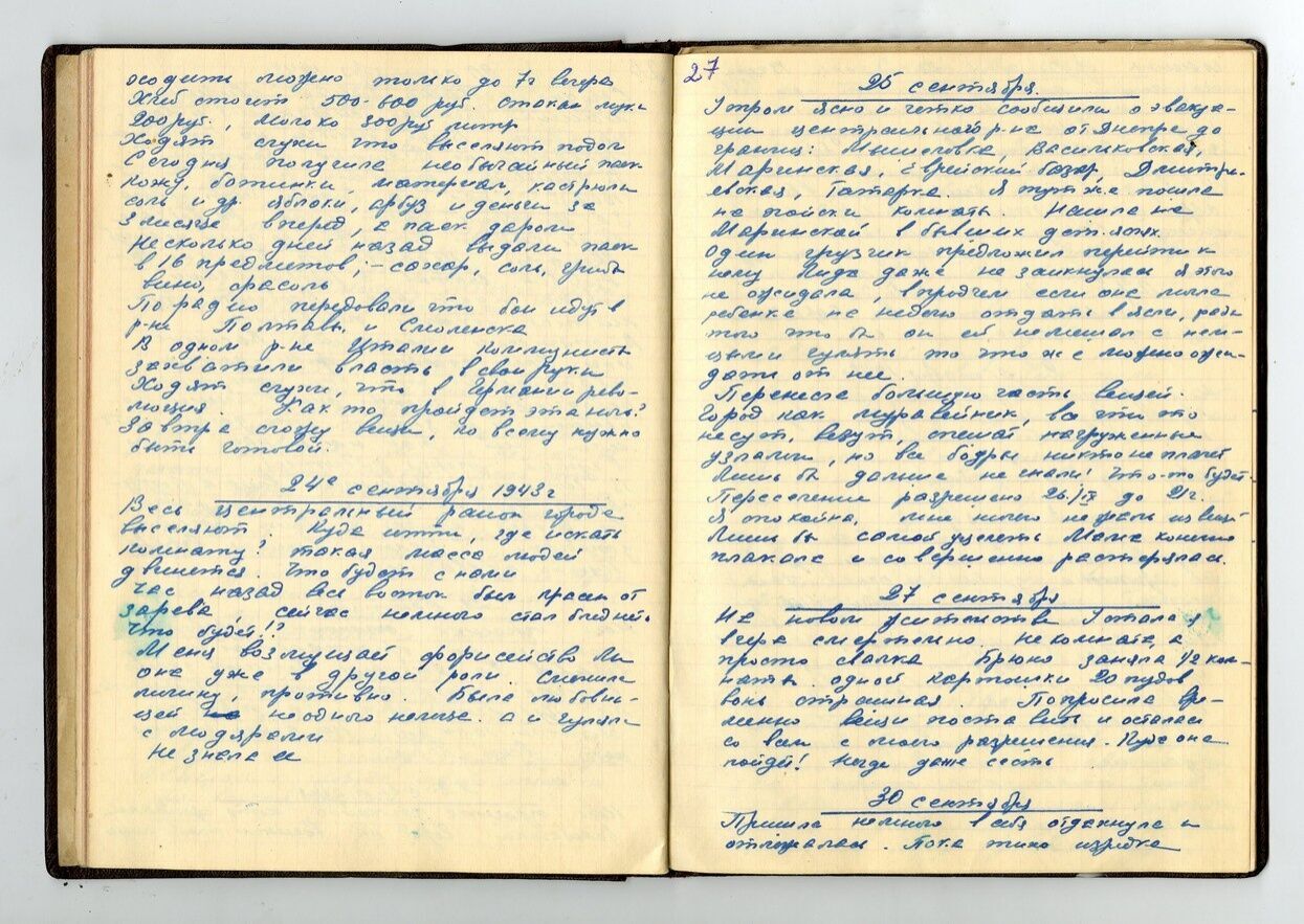 Дороговизна страшная! Масло – 5000 рублей, молоко – 280 рублей литр. Говорят, что мужчины будут мобилизованы, а женщины отправлены в Германию. Говорят, что Киев минируют. Смерти я не боюсь. Будь что будет, лишь бы не быть калекой. Ходит много анекдотов и поговорок. Говорят, что до "Полтавы шли с бомбежкой, а от Полтавы – с гармошкой". А волосы у меня сильно погорели.
