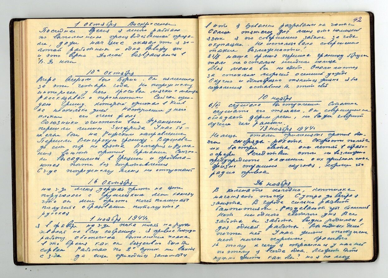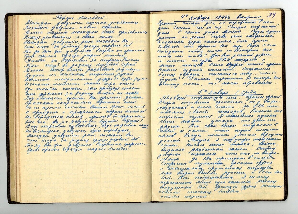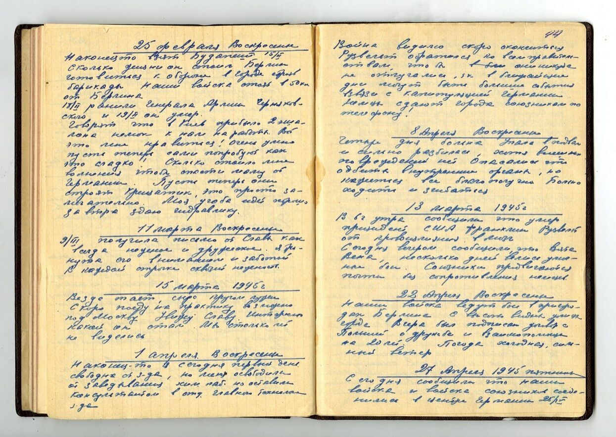Сегодня необычный день! Успехи на всех фронтах. Взяли Краков, Лодзь. Все фронты пошли в наступление. 17.01 взяли Варшаву. Ее мы сильно разбили, т.к. польские офицеры не хотели нас пускать в свою столицу. Тяжелые бои в Будапеште, улицы завалены трупами. В каждом доме рукопашные бои. Скорее бы конец войне.