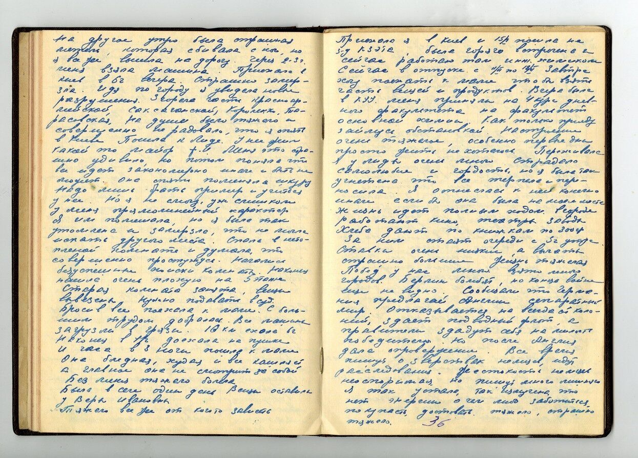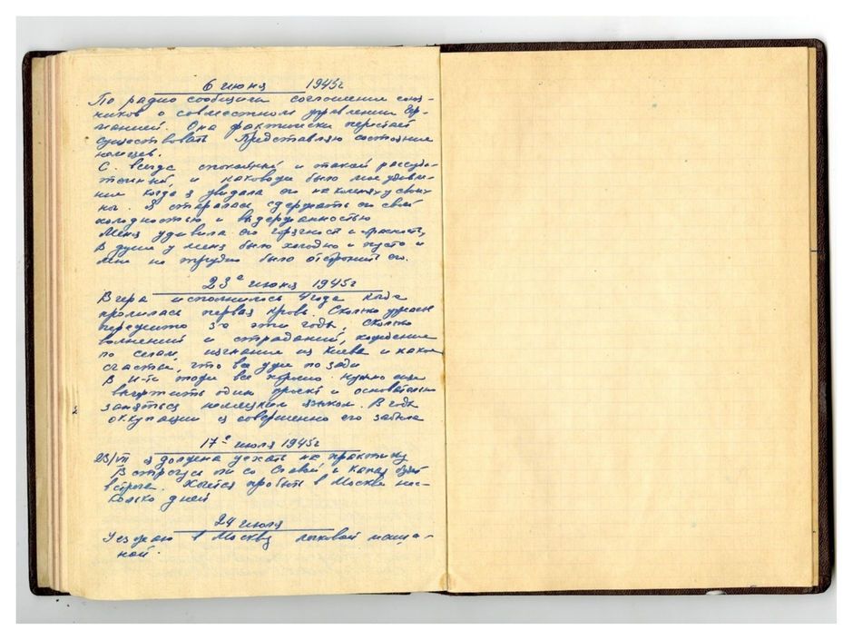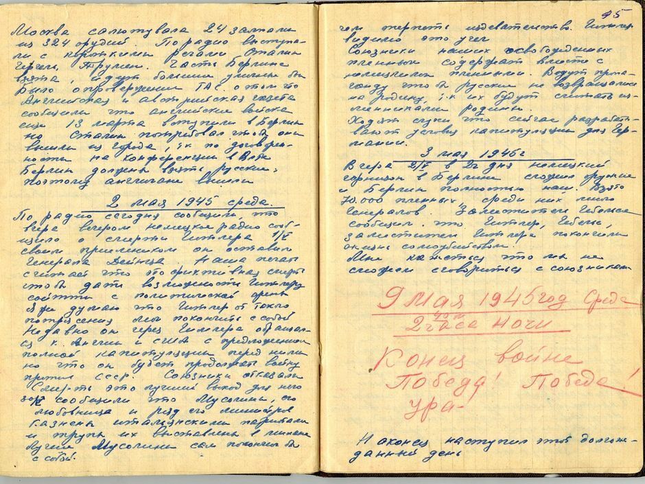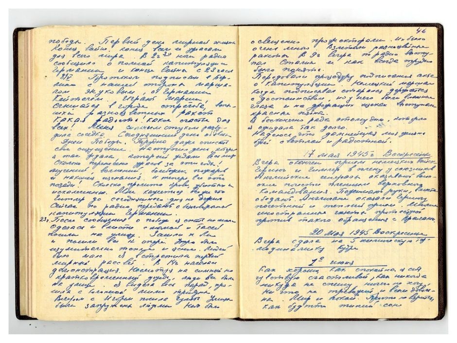 Первый день мирной жизни. Конец войне! Конец всем ее ужасам для всего мира. В 2 часа 30 минут радио сообщило о полной капитуляции Германии и конце войны с 23 часов 8.05. Протокол подписан в Берлине с нашей стороны маршалом Якубовым, от Германии – Кейтелем. Играют марш. Слышится в городе стрельба, вспышки разноцветных ракет. Какая радость! Какое счастье для всех! Меня сильным стуком разбудила соседка. Сегодняшний день объявили Днем победы. Трудно даже описать свои ощущения. Наступил день, которого я так ждала, которого ждал весь мир.