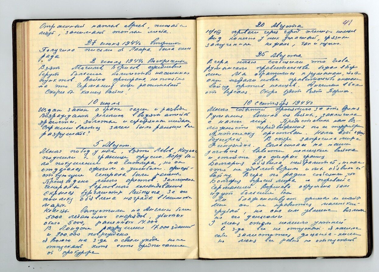 Много побед у нас, взяты Львов, Каунас, подошли к границе Пруссии. 20.07 было покушение на Гитлера, но он отделался ожогом и ушибом. Присутствующие генералы были ранены. Произведено много арестов. Замешаны генералы верховного командования. Скрылся бургомистр Лейпцига. За его поимку объявлена награда в один миллион марок.