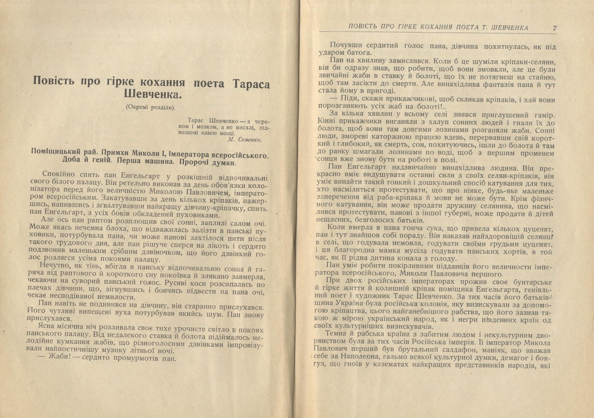 В 1930-м году футурист Гео Шкурупий начал писать роман с рабочим названием "Мочиморди" о Тарасе Григорьевиче Шевченко. Произведение так и не было окончено, но пять глав из него под названием "Повість про гірке кохання поета Тараса Шевченка" были напечатаны в журналах "Життя й революція" и "Нова Генерація". Более того – с тех пор этот текст, представляющий несомненный литературный и исторический интерес, нигде не публиковался! Мы съездили во львовскую библиотеку, где хранятся чуть ли не единственные экземпляры этих журналов, ивосполнили пробел.