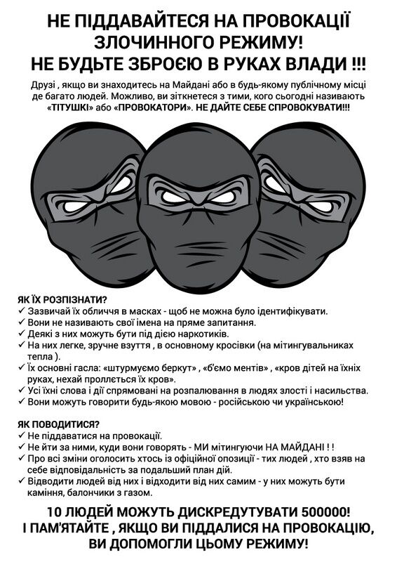 Титушки – новое слово из лексикона украинцев, которое уже выучил весь мир. Так называют крепких спортивных молодых людей, нанятых за деньги, чтобы дестабилизировать обстановку на митингах, развязывать драки, выполнять другие противозаконные действия. Они работают под защитой или при полном бездействии милиции. Фактически это теневая наемная армия, созданная провластными силами против народа Украины.