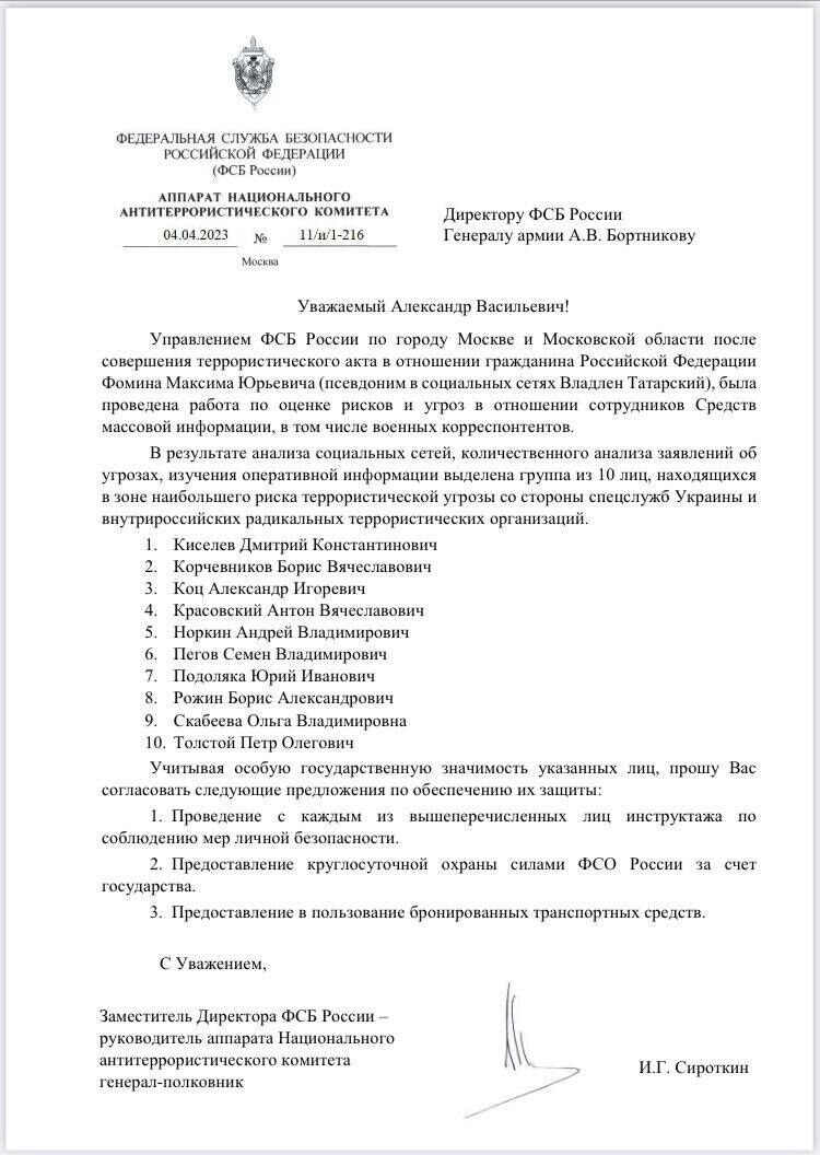 Мені надіслали з Москви цікавий документ. Верифікувати не можу. Але, припускаючи, яка зараз панує паніка у спецслужбах, у котрих під носом, у головних містах країни підривають ось уже другого пропагандиста, не здивувався б, якщо все так і є.