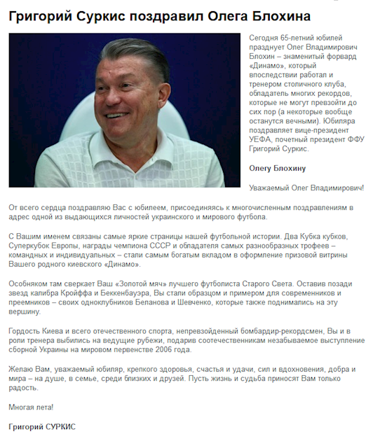 Безумовно, Блохін – особистість у нашому футболі. Дуже яскрава і самобутня. У "Динамо" він провів 19 сезонів, водночас побивши практично всі рекорди радянського футболу. Його досягнення стали вічними і вже ніколи нікому їх не перевершити, оскільки великого і могутнього вже не існує. І ці рекорди за правом належать Україні, її динамівському гравцеві з берегів Дніпра, першому українському володареві "Золотого м'яча". Ювіляра привітав віце-президент УЄФА Григорій Суркіс.