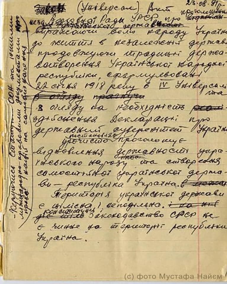 Це було в серпні 2007 року. Я готувався до ефіру і гостював у його автора – Левка Григоровича Лук'яненка. Ще до зустрічі мені розповідали, що чернетка Акта незалежності досі зберігається у нього вдома. Під час бесіди я попросив хоча б подивитися на історичний документ. Він охоче погодився, приніс товстенну папку, сів поруч і почав її перебирати. Я очікував побачити що завгодно, але тільки не цей пожовклий від часу зошит у лінійку, від якої віяло шкільними уроками.