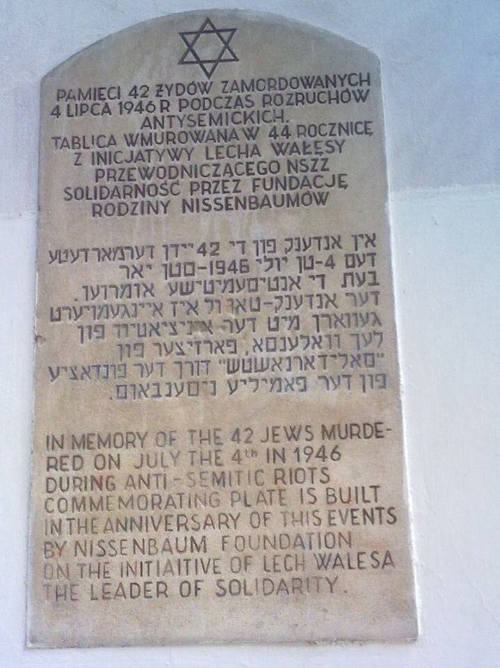 - Про те, що 4 липня 1946 року поляки вчинили погром у місті Кельце проти євреїв, що дивом вижили в ході війни, бо, кажуть, не хотіли повертати їм колишнє житло. На фото пам'ятник жертвам погрому, в результаті якого озвірілими поляками було вбито 42 людей, у тому числі вагітних жінок і дітей.