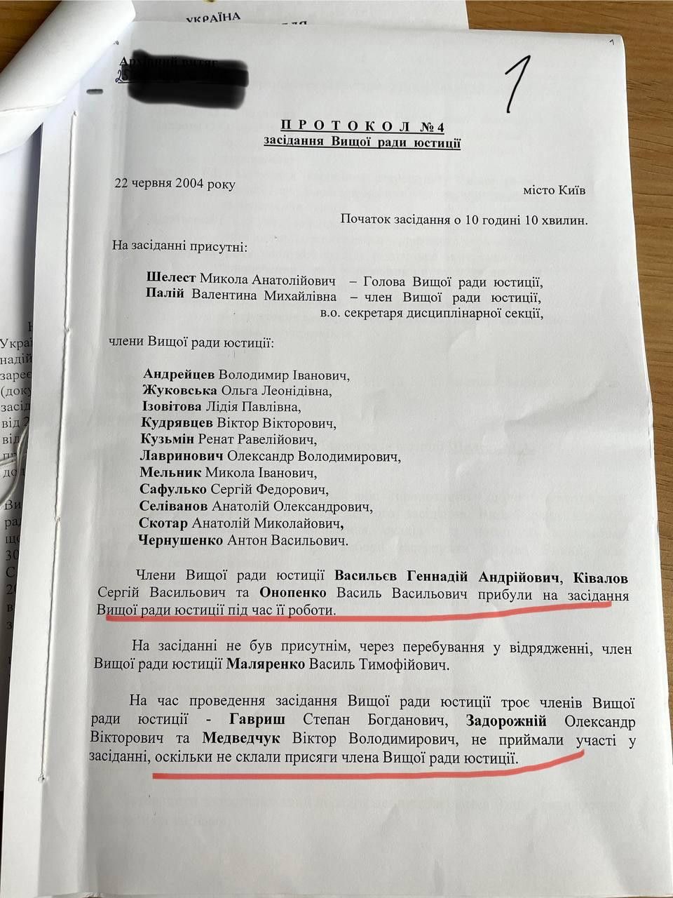 Ключовими є три документи: протокол №4 засідання Вищої ради юстиції від 22 червня 2004 року, протокол №6 засідання ВРЮ від 28 березня 2007 року і протокол №2 засідання ВРЮ від 22 березня 2010 року. Чому ці документи ключові? Тому що там ідеться про обрання керівництва ВРЮ і про те, хто яку роль при цьому грав. Тобто якраз про те, про що Онопенко розповідає журналістам.