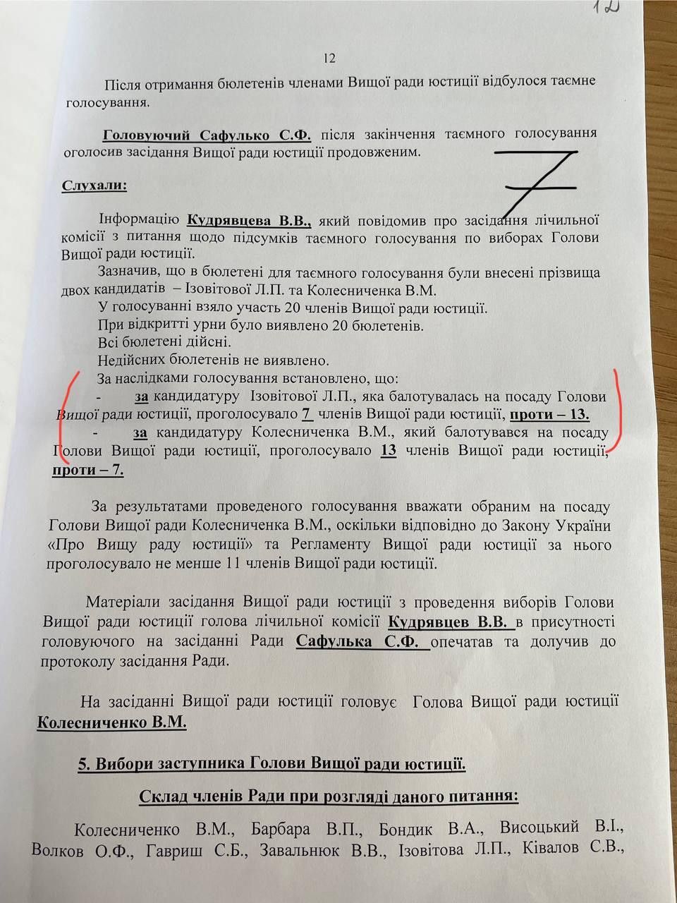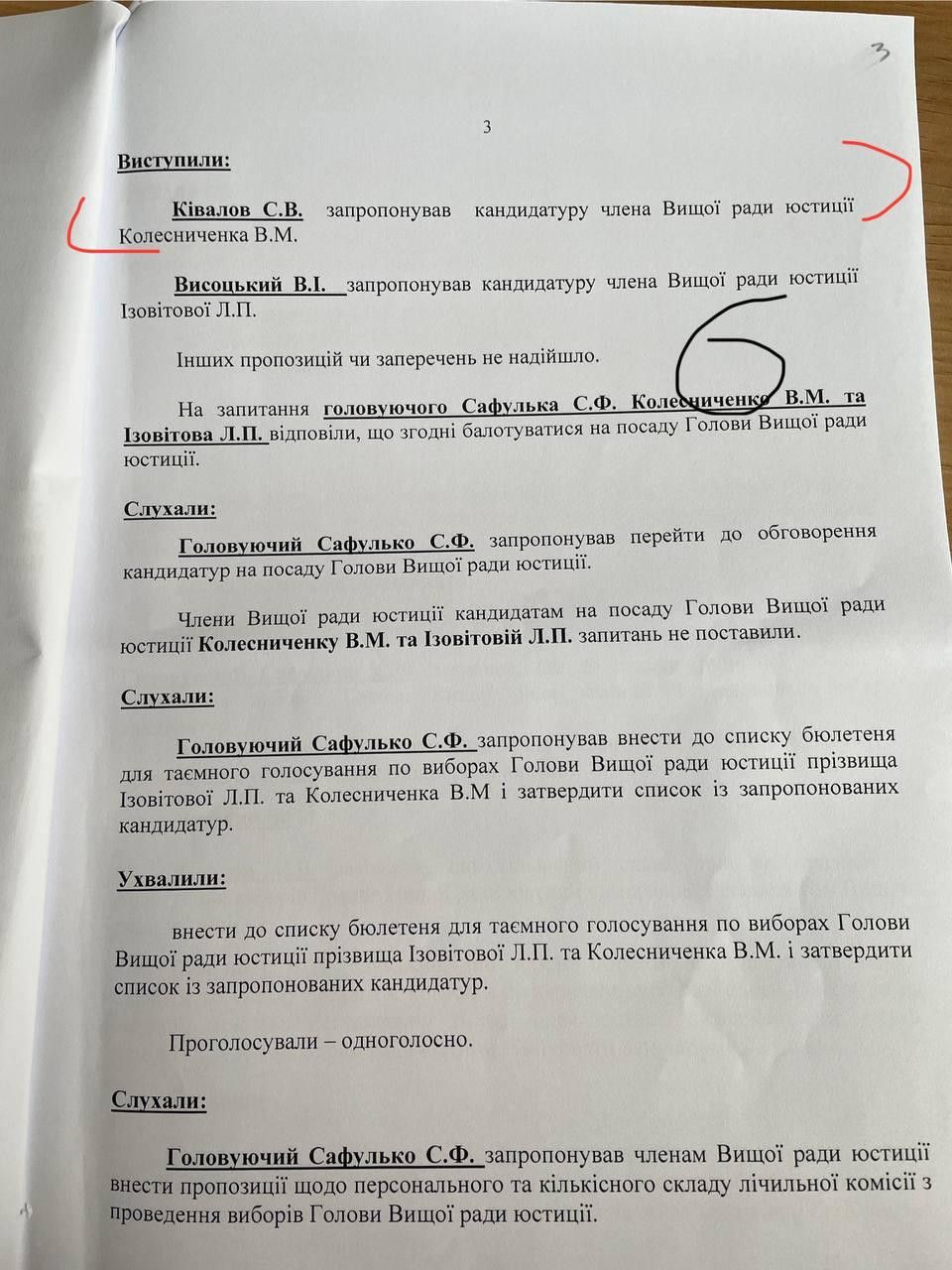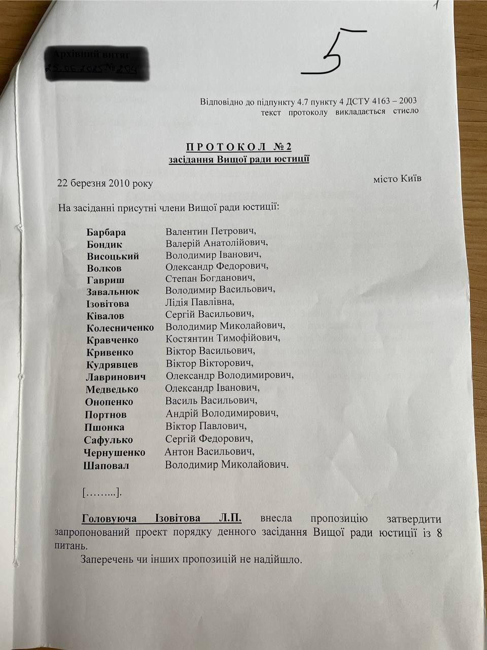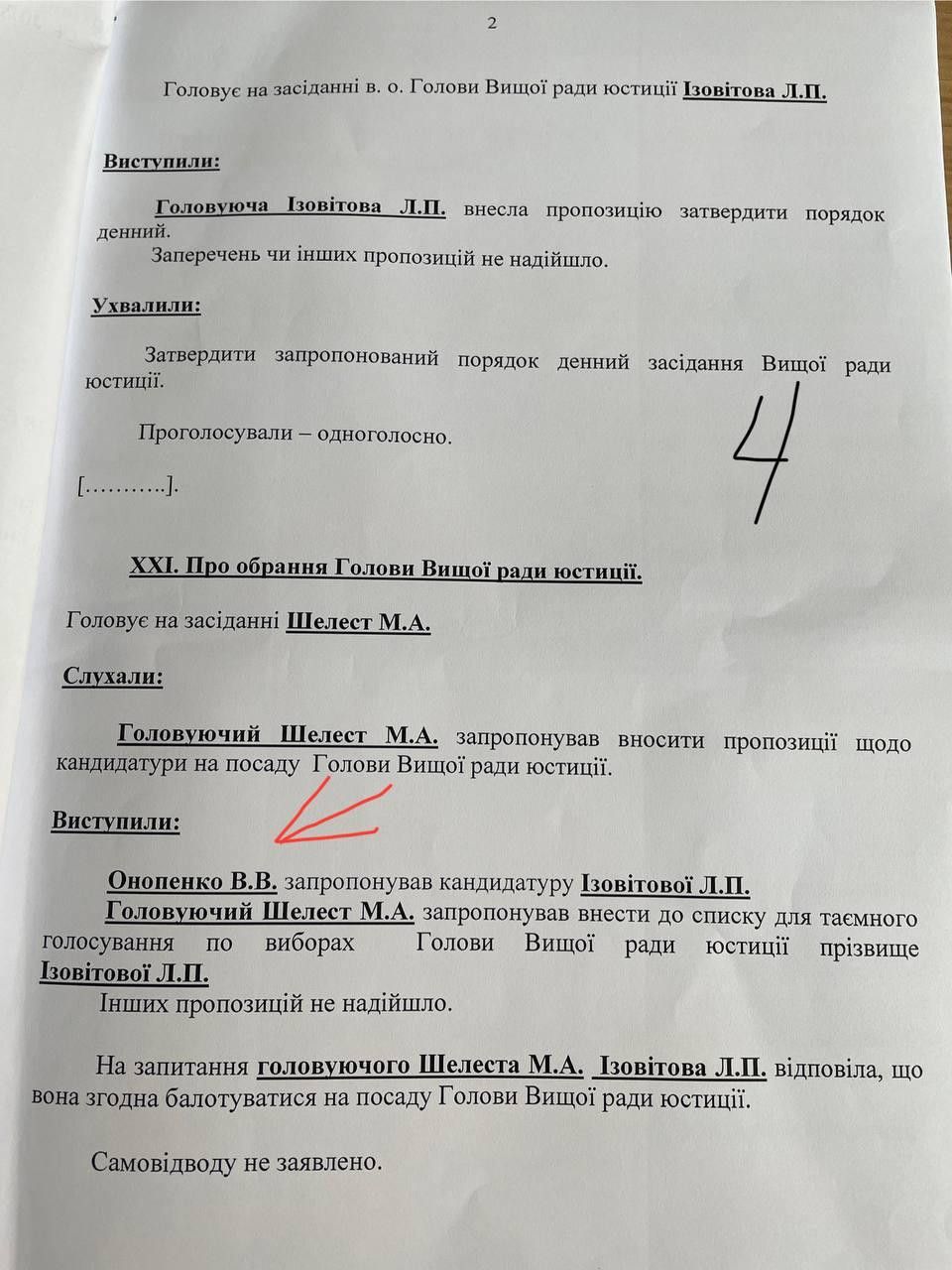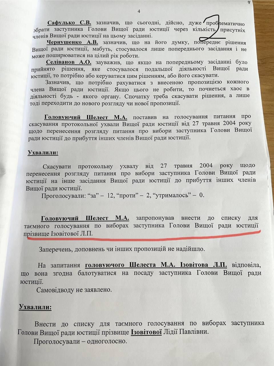 Причому ще цікавий момент – зазвичай у протоколі вказується, хто є головою. Але не в цей раз. Порівняйте з попередніми протоколами. Висловлю свою думку: представники влади Януковича вже все вирішили ще до засідання, тому можна було й не вказувати, хто там голова. Звідси виходить і ще одне питання: а чи такою людиною Януковича (Медведчука, Ківалова, Портнова) була Ізовітова? Дивимося на скрін №6.