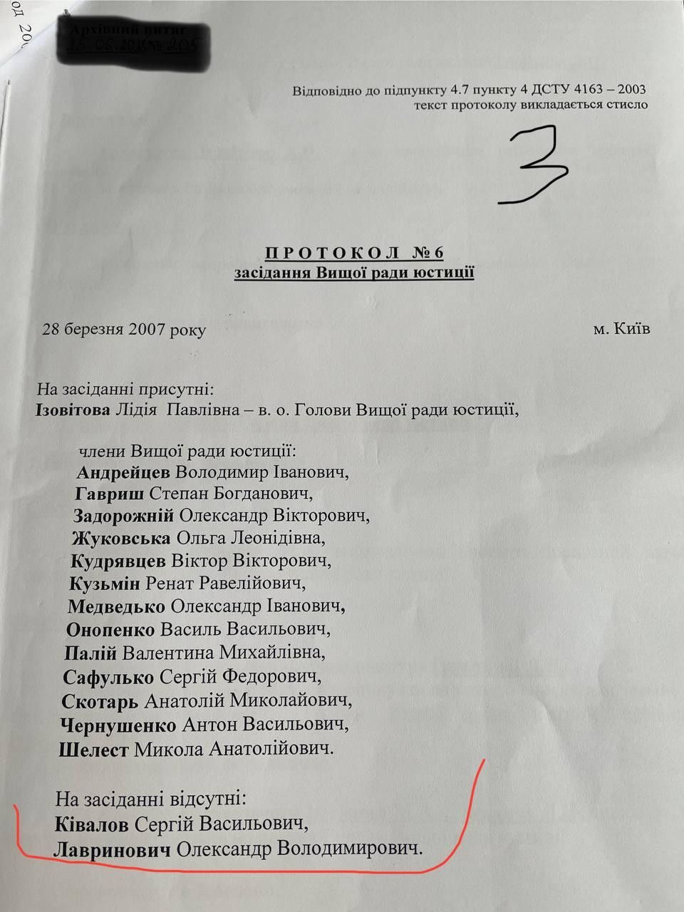 2007 рік. Відбувається засідання з обрання голови Вищої ради юстиції. Як бачимо зі скріна №3, прізвища Медведчука немає ані серед членів ВРЮ, ані серед присутніх, а Ківалов – той узагалі прогуляв (!). Натомість є Онопенко, і знаєте, що він робить на цьому засіданні? Дивимося скрін №4: Онопенко запропоновує кандидатуру Ізовітової Л.П. на посаду голови ВРЮ! Однак на кадрах із "розслідування" він свідчить, що "Ізовітова – людина Медведчука" й саме Медведчук її просував, але ж чого тоді висуває її Онопенко?! Тобто пан Василь знов плутається й у спогадах, і в показах. А його теза, мовляв, "Ківалов, Медведчук, Ізовітова – це все одна компанія" виглядає як бажання догодити журналістам.